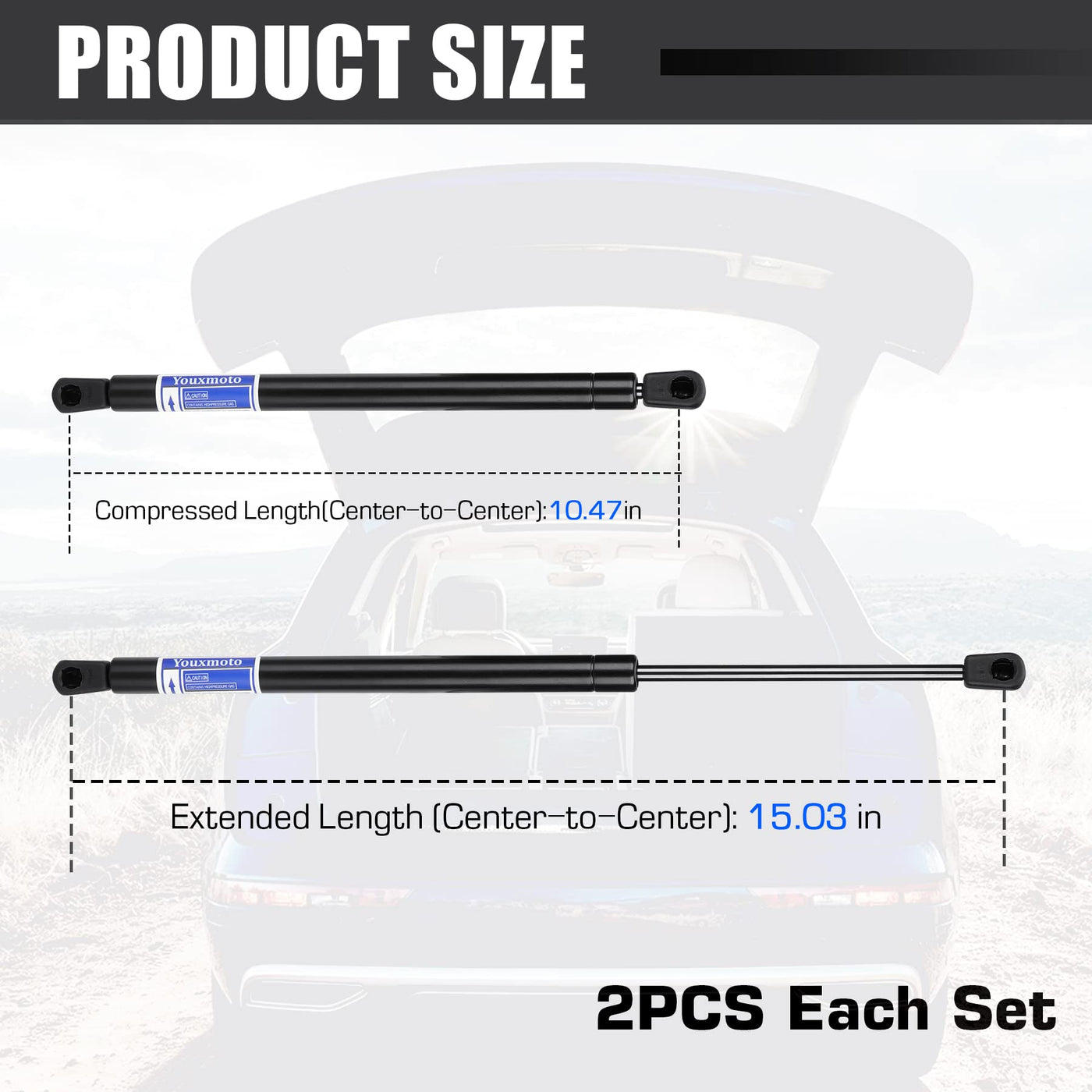Brand: Youxmoto Installation Position: Rear Window Glass Placement on Vehicle: Rear Left, Right Extended Length [in]: 15.03'' Compressed Length [in]: 10.47'' Reference Number: 6601, 55394245AB, 55394245AD, 68025357AA, SG414043, 10029724, 8196272 Quantity : A Set of Two Pieces Compatible Vehicles: For Jeep 2005 2006 2007 2008 2009 2010 Grand Cherokee Fitment: For Jeep 2005-2010 Grand Cherokee Base Sport Utility 4-Door 2005-2010 Grand Cherokee Laredo Sport Utility 4-Door 2005-2010 Grand Cherokee Limited Premium Sport Utility 4-Door 2005-2010 Grand Cherokee Limited Sport Utility 4-Door 2005-2010 Grand Cherokee North Edition Sport Utility 4-Door 2005-2010 Grand Cherokee Overland Sport Utility 4-Door 2005-2010 Grand Cherokee S Limited Sport Utility 4-Door 2005-2010 Grand Cherokee SRT Sport Utility 4-Door 2005-2010 Grand Cherokee SRT8 Sport Utility 4-Door FEATURES 1.Exact fit original equipment design guarantees correct fit and function. 2.Easy to install with simple hand tools in just minutes. 3.Engineered and built to meet or exceed OE. quality standards. 4.Hardened, Chrome Plated Steel Piston Rod; Rubber O-ring piston seal for controlled lift. 5.Heavy gauge steel pressure tube provides long life; the backup ring gives enhanced performance. 6.Multi-lobe seal offers leak-free operation and long life. 7.The self-clean piston assembly delivers smooth operation and consistent performance.
