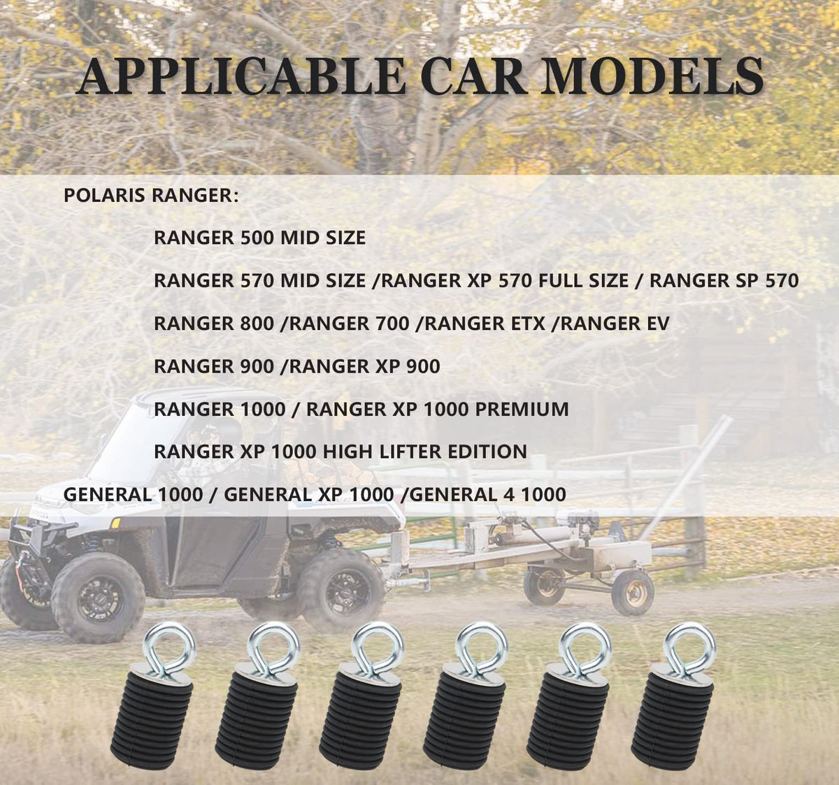 UTV Ranger Tie Down Anchors for Polaris General Ranger 500 570 1000 XP 900 800 700 Easy to install and remove: These bed tie down anchors are easy to install, just insert the product into the hole, turn and tighten; to remove, just twist in the opposite direction. (Please note: adding some lubricant before installation will make installation easier) More stability: The bottom of These bed tie down anchors have a quadrangular hook, 4 directional design makes it more stable in the process of use.a quadrangular hook at the bottom, and the 4-way design enhances its stability during use. Specifications: Anchol Hole Size:1.5'' Anchor Length:2 inch Whole Length:3.18inch Color: Black Material: High quality durable rubber Package Included:6Pcs tie down anchors. Compatibility: These ATV UTV lock and ride anchors are suitable for Polaris Ranger and General Polaris Ranger 500 Mid Size Polaris Ranger 570 Mid Size /Ranger XP 570 Full Size / Ranger SP 570 Polaris Ranger 800/Ranger 700/Ranger ETX /Ranger EV Polaris Ranger 900/Ranger XP 900 Polaris Ranger 1000/ Ranger XP 1000 Premium/ Ranger XP 1000 High Lifter Edition General 1000/ General XP 1000/General 4 1000 Note: These DO NOT compatible with RZR, Sportsman or Ace.Please check the size and compatibility before buying. If you have any questions about these bed tie down anchors, please feel free to contact us, we will be the first time to solve for you, to provide you with satisfactory service.