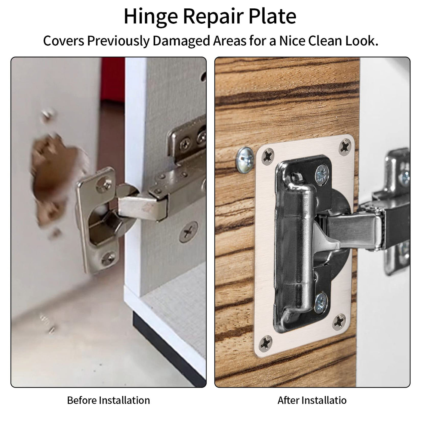 Q: How do I install the hinge repair plates?A: Installation is straightforward. The kit includes both a decorative plate and a side panel, along with a Phillips screwdriver to assist you. Simply align the plates over the damaged area and secure them in place using the provided screws.