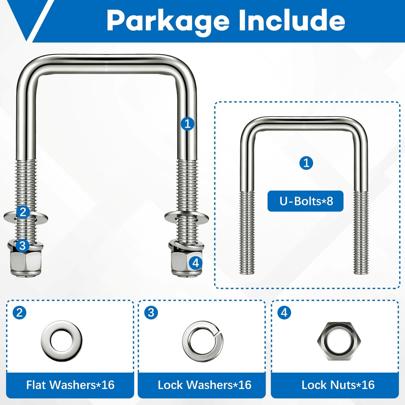 Features: It is recommended to use lubricant during installation to prevent wear. Use a hand wrench or socket ratchet when installing the nut. Do not use a high-speed power tool or impact tool to tighten the nut. U-bolts must be tightened using hand tools ONLY and threaded on correctly. Improper threading, use of power tools, over-tightening or tightening too fast will result in galling or sticking of the nut. Specifications: Material: stainless steel Color: silver Main size: 1/2 x 3-1/16 x 4-5/16 inch (D x W x L) Package includes: 8 x Heavy duty u-bolts 16 x Stainless steel flat washers 16 x Stainless steel nylon lock nuts 16 x Lock washers Notes: Manual measurement, please allow slight errors on size. The color may exist a slight difference due to different screen displays.