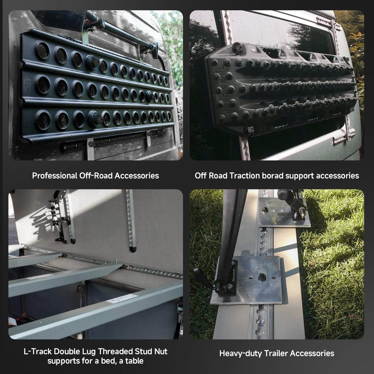 Q: Is the L-Track Double Lug Threaded Stud compatible with other tie-down systems?A: Yes, the L-Track Double Lug Threaded Stud is designed to work with various tie-down systems, allowing you to secure logistics ratchets, cam buckles, ropes, and bungee ropes for effective cargo management.