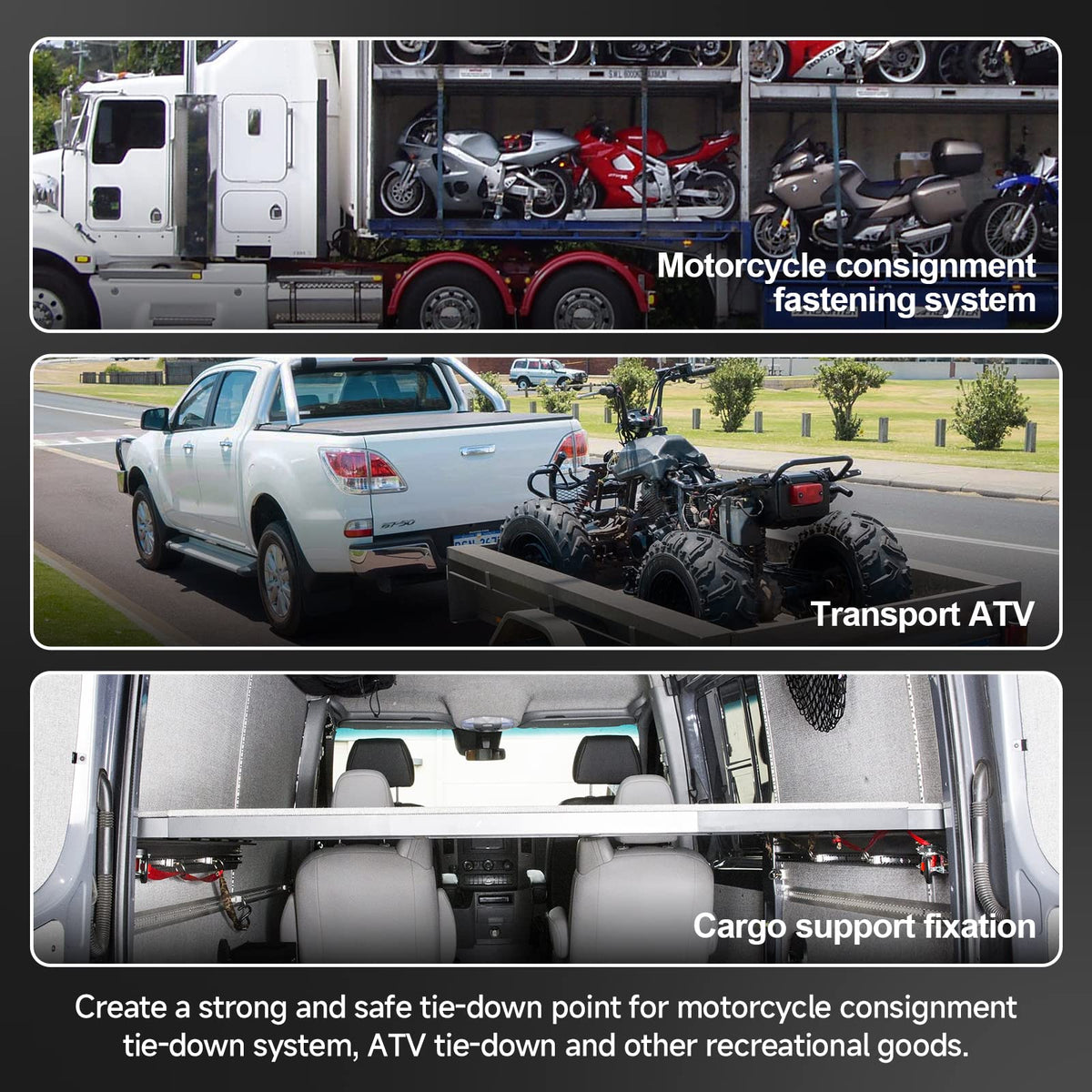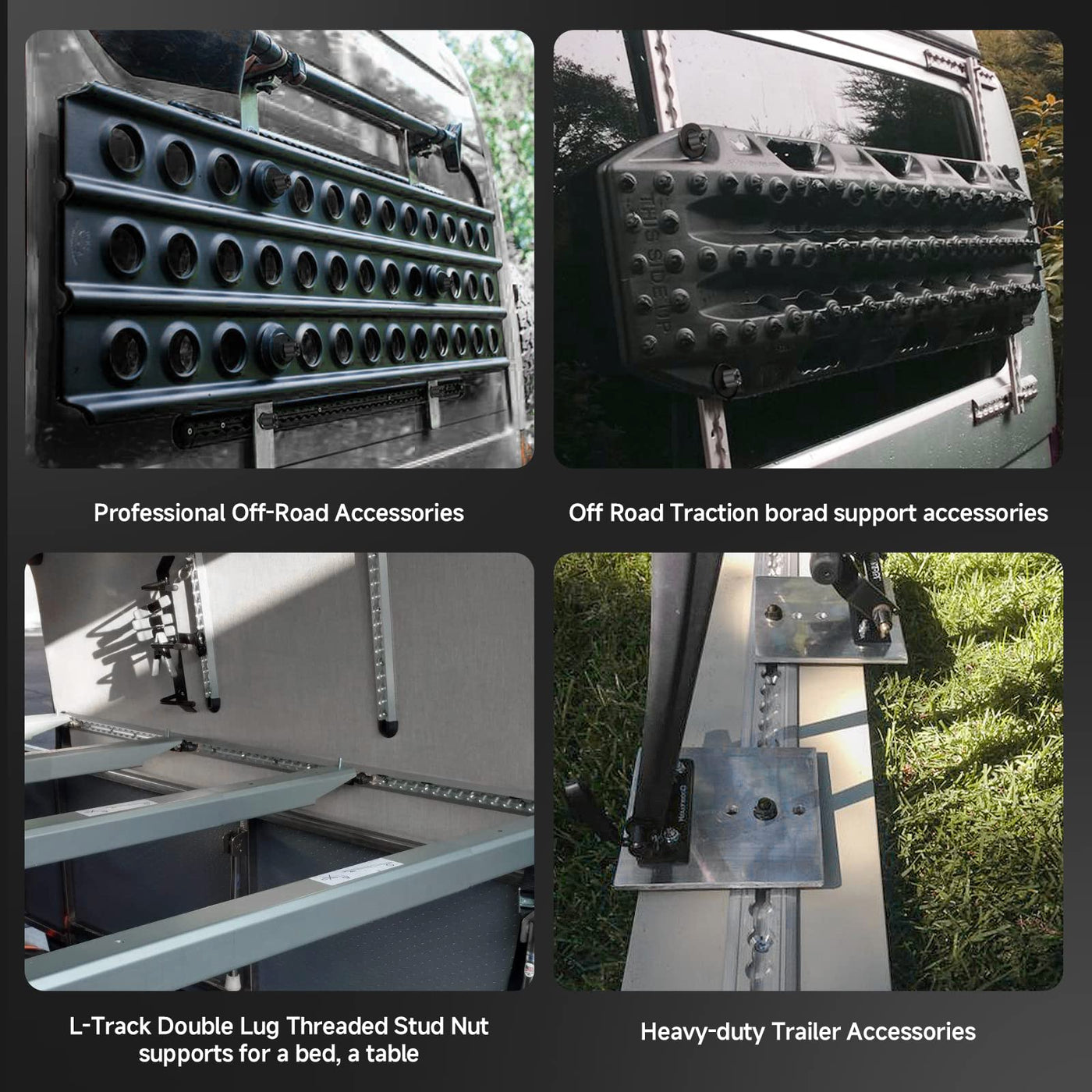 Q: What can I use the L-Track Double Lug Threaded Stud for?A: The L-Track Double Lug Threaded Stud can be used for securing motorcycles, ATVs, boxes, pallets, ladders, and various other items, making it versatile for cargo management in trailers, trucks, and more.