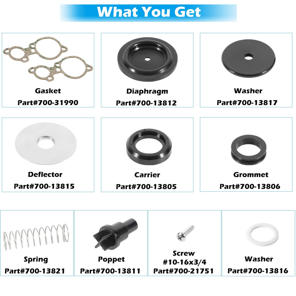 Q: What parts are included in the Poppet Valve Kit?A: The kit contains essential components for repair and maintenance, including a new carrier, grommet, poppet, diaphragm, deflector, washer, spring, screw, and gaskets. These parts work together to ensure the proper functioning of your outboard engine's poppet valve.