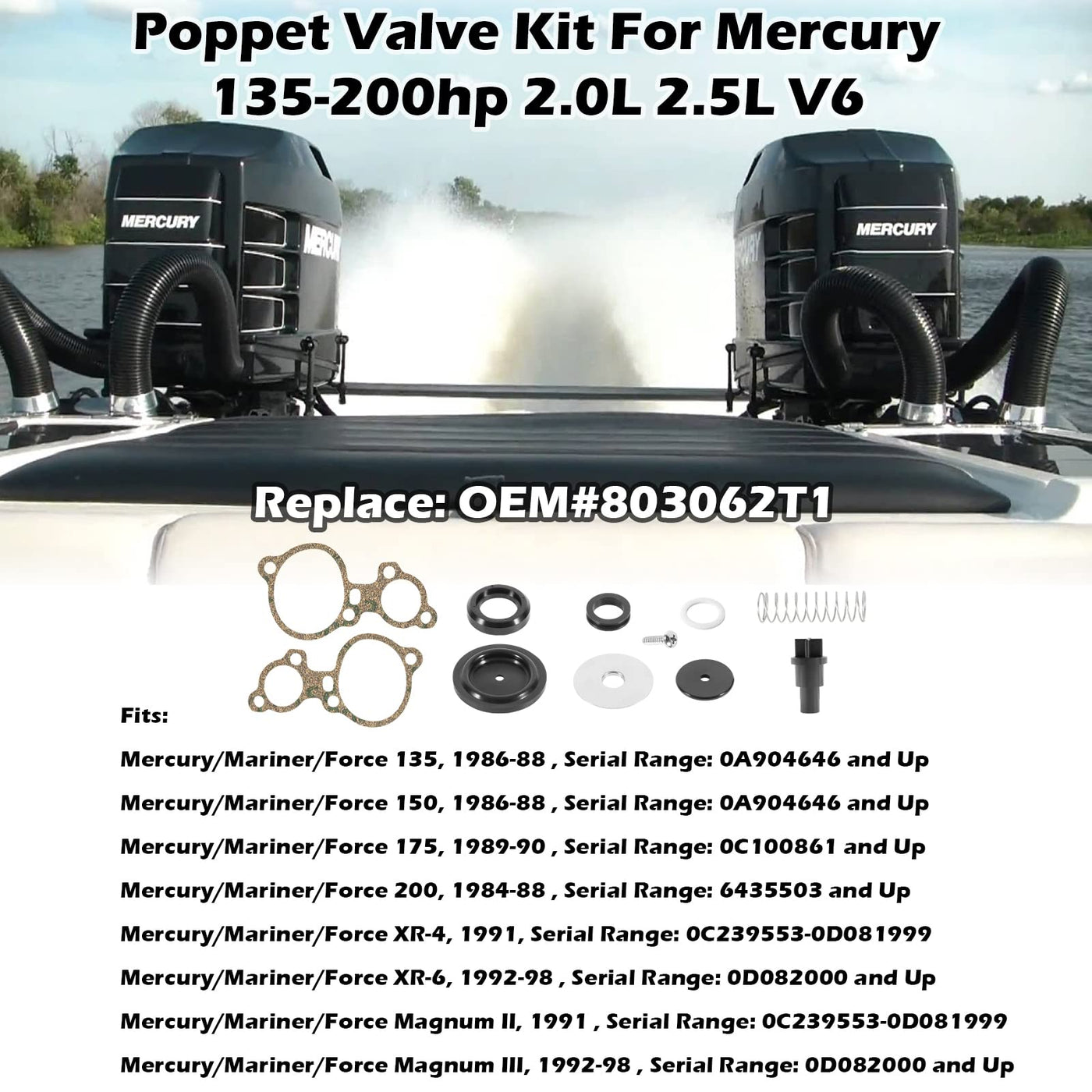 Poppet Valve Kit Replace Oem 8030-1 803062T1 803062T1 For Mercury/Mariner/Force 135, 1986-88 Serial Range: 0A904646 And Up; For Mercury/Mariner/Force 150, 1986-88, Serial Range: 0A904646 And Up; For Mercury/Mariner/Force 175, 1989-90, Serial Range: 0C100861 And Up; For Mercury/Mariner/Force 200, 1984-88, Serial Range: 6435503 And Up; For Mercury/Mariner/Force Xr-4, 1991, Serial Range: 0C239553-0D081999; For Mercury/Mariner/Force Xr-6, 1992-98, Serial Range: 0D082000 And Up; For Mercury/Mariner/Force Magnum Ii, 1991, Serial Range: 0C239553-0D081999; For Mercury/Mariner/Force Magnum Iii, 1992-98, Serial Range: 0D082000 And Up