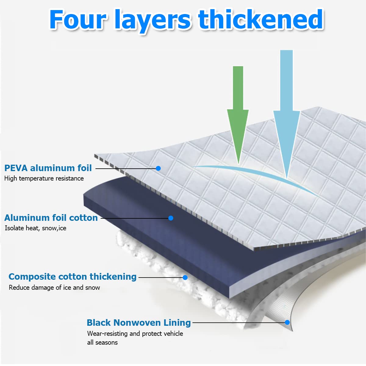 Q: What materials are used in the 8sanlione Car Windshield Snow Cover?A: The 8sanlione Car Windshield Snow Cover is made from a durable 4-layer construction, including aluminum film, spunlace cotton, non-glue cotton, and non-woven material. This combination provides excellent protection against snow, frost, ice, and UV rays.