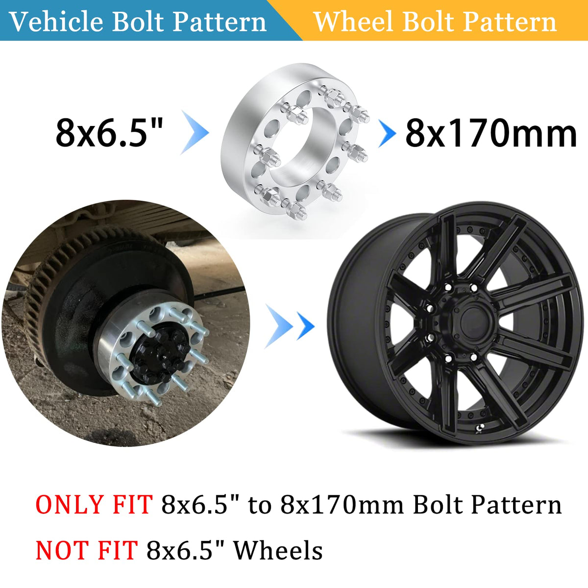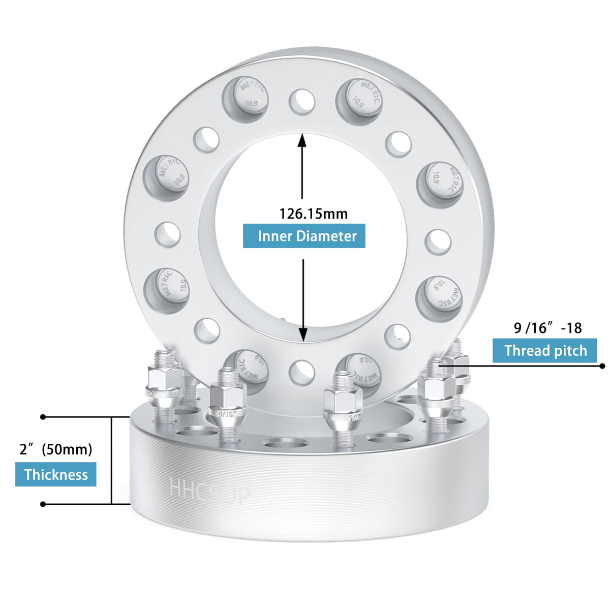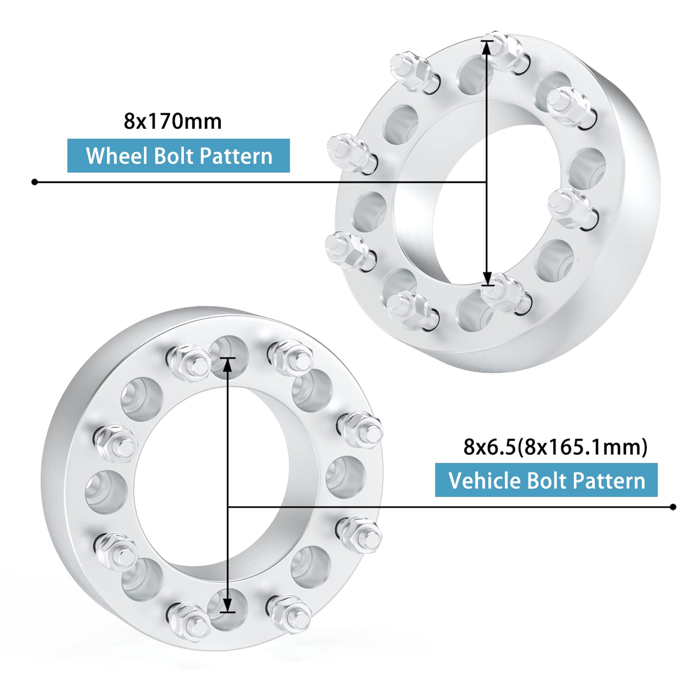 Q: What is the thickness and specifications of the wheel spacers?A: The wheel spacers have a thickness of 2 inches (50mm) and feature a vehicle bolt pattern of 8x6.5 inches (8x165.1mm), a wheel bolt pattern of 8x170mm, a wide hub bore size of 126.15mm, and a thread pitch of 9/16"-18.