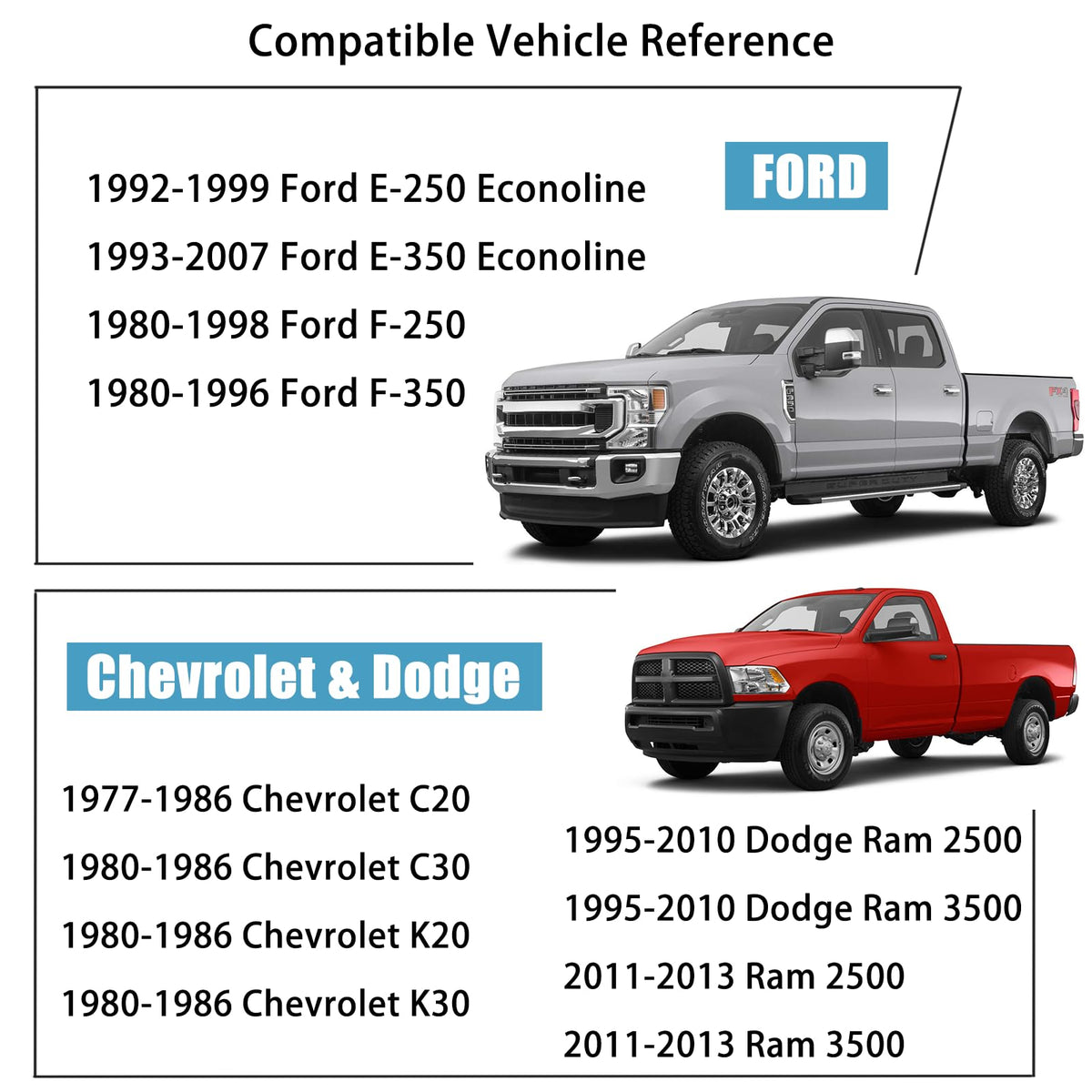 Q: What vehicles are compatible with the 8x6.5 to 8x170 Wheel Spacers?A: These wheel spacers are compatible with various models including the 1980-1998 Ford F250, 1992-2007 Ford E250, 1995-2010 Dodge Ram 2500 and 3500, as well as the 1977-1986 Chevrolet C20, C30, K20, and K30.