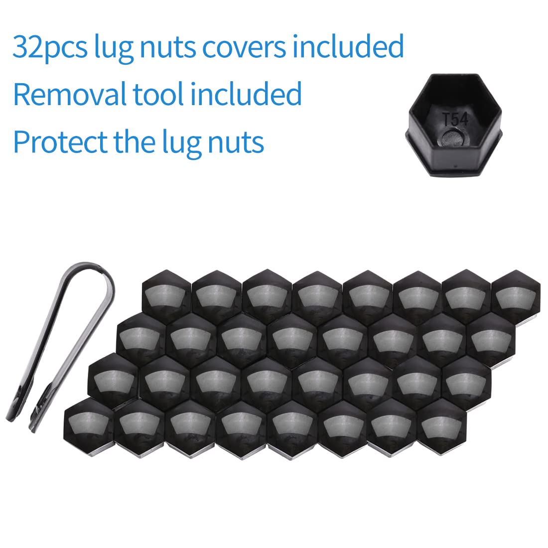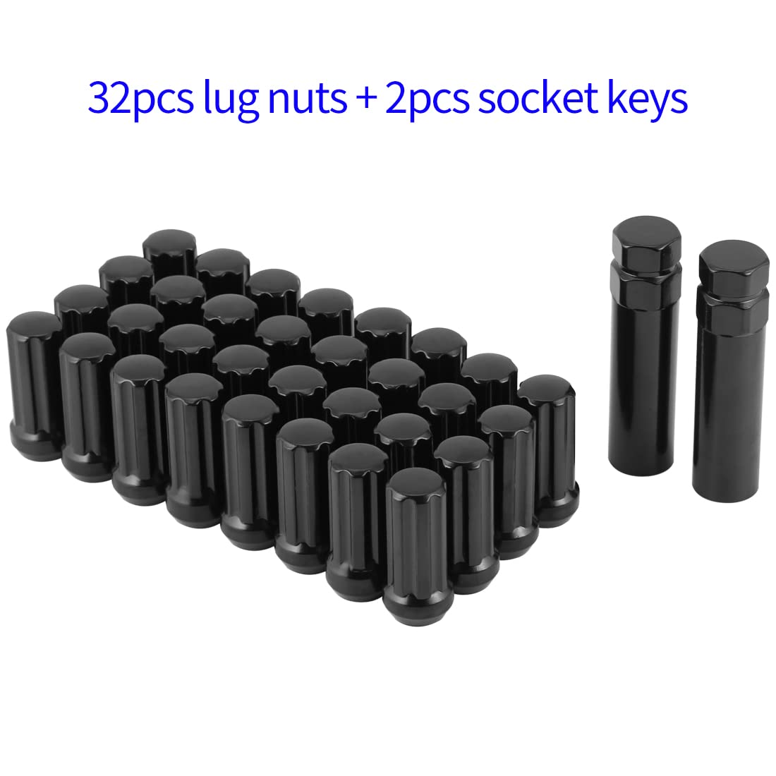 Q: What are the specifications of the lug nuts in this set?A: This lug nut set includes 32 pieces made from SCM435 steel, cold forged and heat treated for durability. The specifications include a thread pitch of 9/16-18, a height of 2 inches (51mm), a diameter of 0.91 inches (23mm), and a bulge acorn design with a 60-degree cone/conical seat.