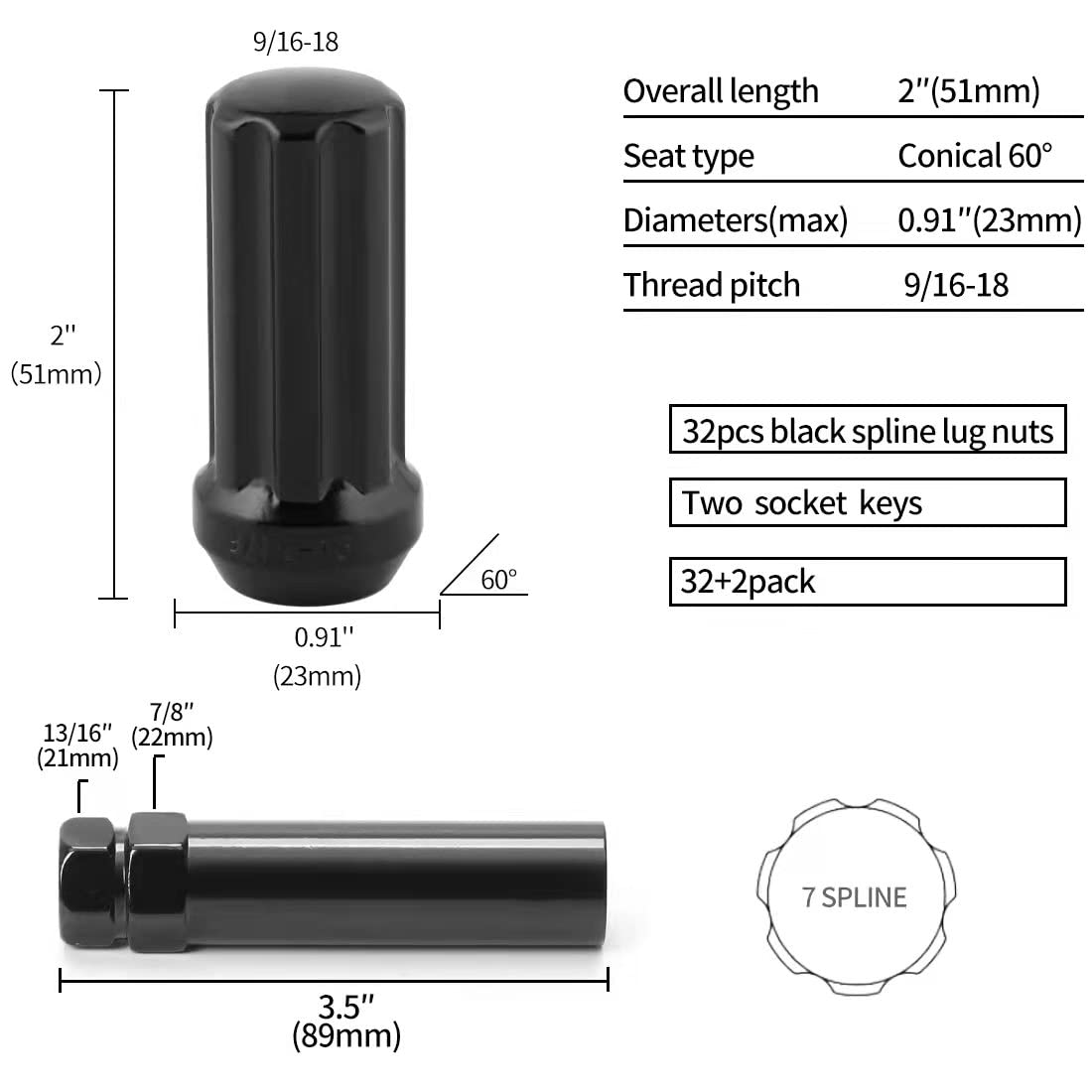 9/16-18 Lug Nut Set 32 Black 7 Spline 2 Inch Tall 9/16 Lug Nuts Acorn 9/16X18 Lug Nuts Wheel Lug Nuts Closed End Fit For Dodge 1
