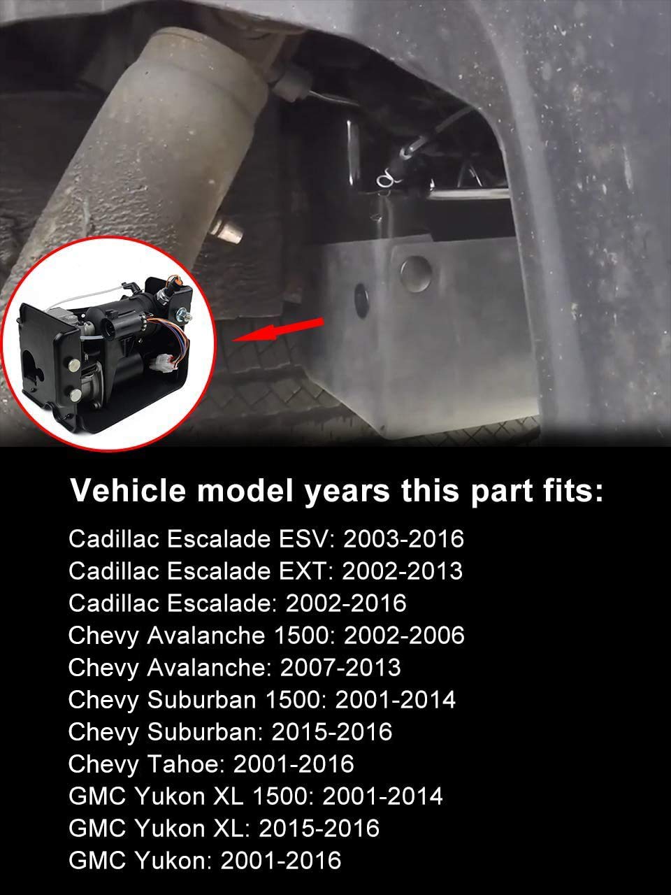 - Q: What vehicles are compatible with the 949-001 Air Ride Suspension Compressor Pump? A: The 949-001 Air Ride Suspension Compressor Pump fits various models including Cadillac Escalade (2002-2016), Cadillac Escalade ESV (2003-2016), Cadillac Escalade EXT (2002-2013), Chevrolet Avalanche (2002-2013), Chevrolet Suburban (2001-2016), Chevrolet Tahoe (2001-2016), GMC Yukon (2001-2016), and GMC Yukon XL (2001-2016). Always check your vehicle trim for proper compatibility.