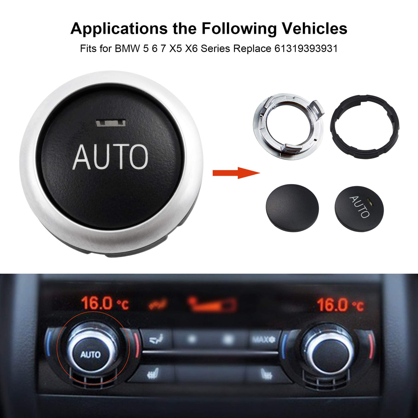 Excellent Function: A/C air conditioning auto temperature climate control knob switch used to control the air conditioning temperature of the climate control panel in the front of the car and the climate control panel in the rear seat. Fitment: Fits for BMW 520i/ 528i/ 528i xDrive 2012-2016. Fits for BMW 530i 2012-2013. Fits for BMW 535i 2010-2016. Fits for BMW 535i xDrive/ 640i 2011-2016. Fits for BMW ActiveHybrid 5 2013 2016. Fits for BMW M5 2012-2016. Fits for BMW 550i 2010-2011. Fits for BMW 550i xDrive 2010-2014. Fits for BMW 640i xDrive/ 650i xDrive 4.0 2013-2016. Fits for BMW 650i xDrive 4.4 2011-2012. Fits for BMW 650i 2012-2013. Fits for BMW M6 2012-2016. Fits for BMW 730Li/ 740Li 2009-2015. Fits for BMW 740Li xDrive 2013-2015. Fits for BMW 750Li 2009-2012. Fits for BMW 750Li xDrive 2011-2014. Fits for BMW 760Li 2010-2015. Fits for BMW ActiveHybrid 7 2013. Fits for BMW ActiveHybrid 7L 2010-2011. Fits for BMW X5 2014-2016. Fits for BMW X6 2015-2016. Replace Part Number: 61319393931 Includes: 1 knob cover with ''AUTO''. 1 knob cover without ''AUTO''. 1 chrome plated ring. 1 rubber ring. Note: Please check the pictures and specifications for details before your buy. Service: You will receive a 24-months service on our product. If you have any doubts, please share with us. We will reply you within 12 hours.