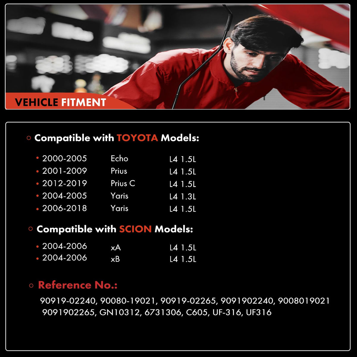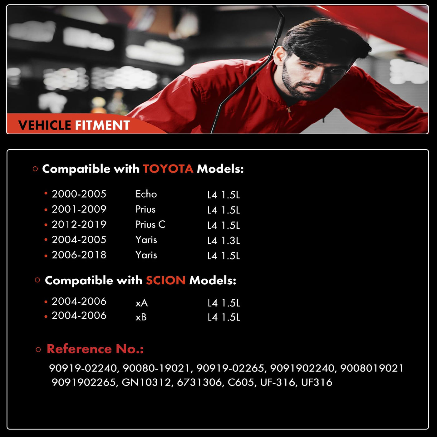 A-Premium ignition coils are a part of engine ignition system, inserting power into spark plugs and ensure fast starts, and an ideal choice to replace your broken coils. All ignition coils meet or exceed OEM specifications, which come with one year unlimited mileage quality guarantee. Application: Compatible with Scion XA 2004-2006 Engine I4 1.5L 1NZ-FE Compatible with Scion XB 2004-2006 Engine I4 1.5L 1NZ-FE Compatible with Toyota Echo 2000-2005 Engine I4 1.5L 1NZ-FE Compatible with Toyota Prius 2001-2009 Engine I4 1.5L 1NZ-FXE Compatible with Toyota Prius C 2012-2019 Engine I4 1.5L 1NZ-FXE Compatible with Toyota Yaris 2006-2014 Engine I4 1.5L 1NZ-FE Compatible with Toyota Yaris 2004 Engine I4 1.5L 1NZ-FE Reference Number:9091902240, UF316 Compatible with Connector: 4 PinsQuantity Sold: Four Pieces