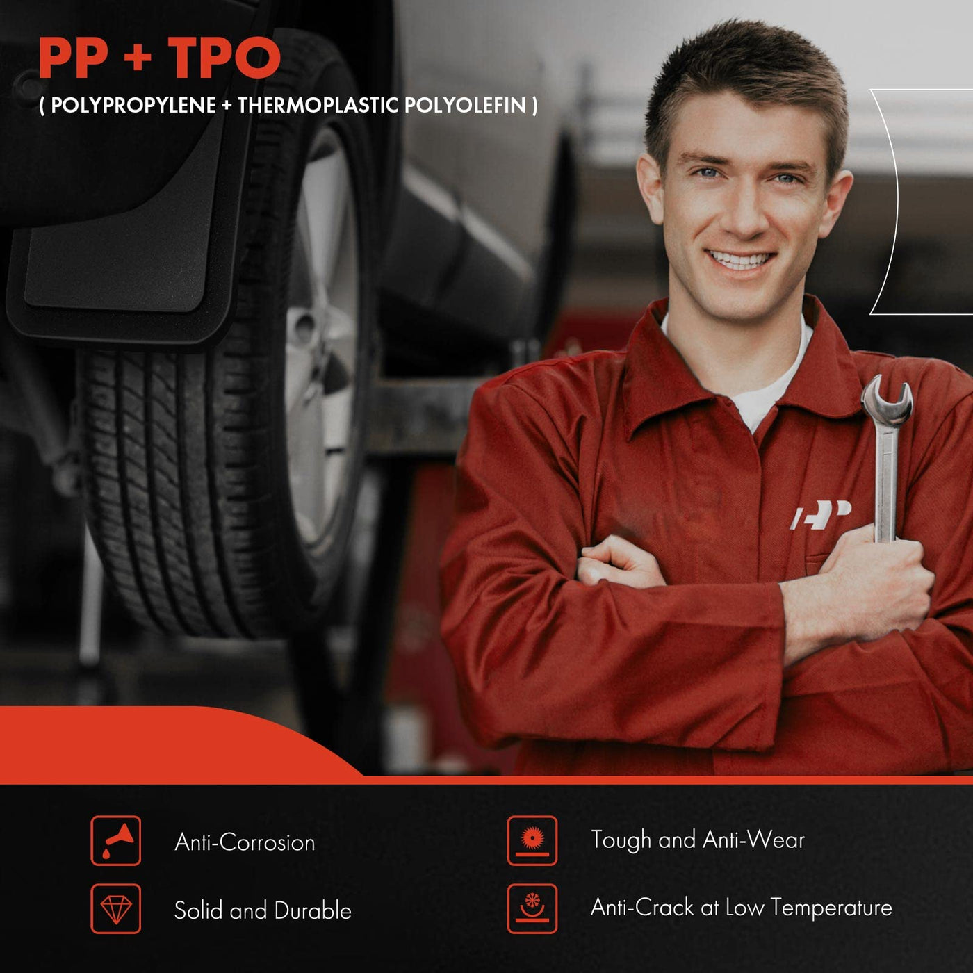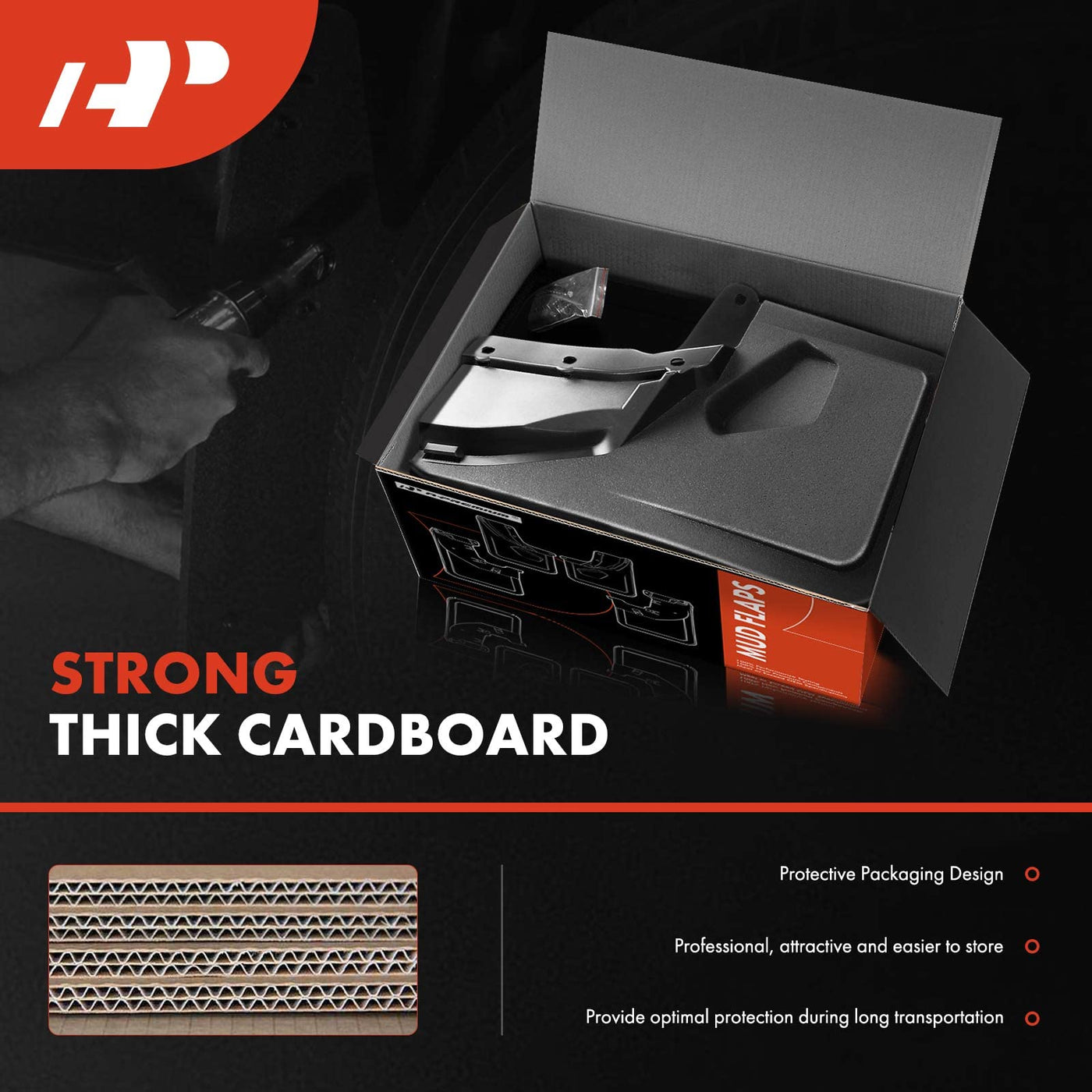 Q: What advantages do A-Premium mud flaps offer for vehicle protection?A: A-Premium mud flaps protect your vehicle from damage caused by snow, water, mud, gravel, and other debris. They help reduce the frequency of washing and painting, and also prevent premature rusting of tie rods and ball joints.