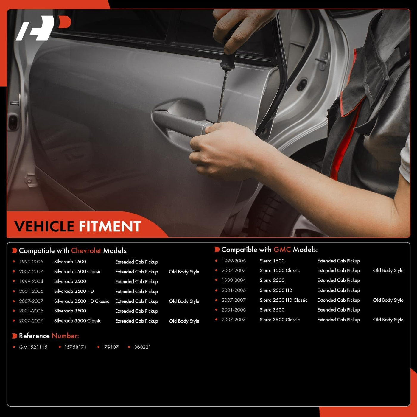 A-premium Exterior Door Handles are an ideal choice to replace your broken Exterior Door Handles. All Exterior Door Handles meet or exceed OEM specifications. Due to high manufacturing standard, it will come with one year quality guarantee. Compatible with Chevrolet Models: 1999-2006 Silverado 1500 Extended Cab Pickup 2007-2007 Silverado 1500 Classic Extended Cab Pickup Old Body Style 1999-2004 Silverado 2500 Extended Cab Pickup 2001-2006 Silverado 2500 HD Extended Cab Pickup 2007-2007 Silverado 2500 HD Classic Extended Cab Pickup Old Body Style 2001-2006 Silverado 3500 Extended Cab Pickup 2007-2007 Silverado 3500 Classic Extended Cab Pickup Old Body Style Compatible with GMC Models: 1999-2006 Sierra 1500 Extended Cab Pickup 2007-2007 Sierra 1500 Classic Extended Cab Pickup Old Body Style 1999-2004 Sierra 2500 Extended Cab Pickup 2001-2006 Sierra 2500 HD Extended Cab Pickup 2007-2007 Sierra 2500 HD Classic Extended Cab Pickup Old Body Style 2001-2006 Sierra 3500 Extended Cab Pickup 2007-2007 Sierra 3500 Classic Extended Cab Pickup Old Body Style Specifications: Color / Finish: Textured Black Material: Metal & Plastic OEM Number: GM1521115, 15758171, 79107, 360221 Location: Rear Right (Passenger Side) Quantity Sold: One Piece Note: It comes without Key Hole. It fits for Extended Cab Pickup only, not for Standard / Crew Cab Pickup. It fits for Chevrolet / GMC Classic Model 2007 Old Body Style only, not for New Body Style Model