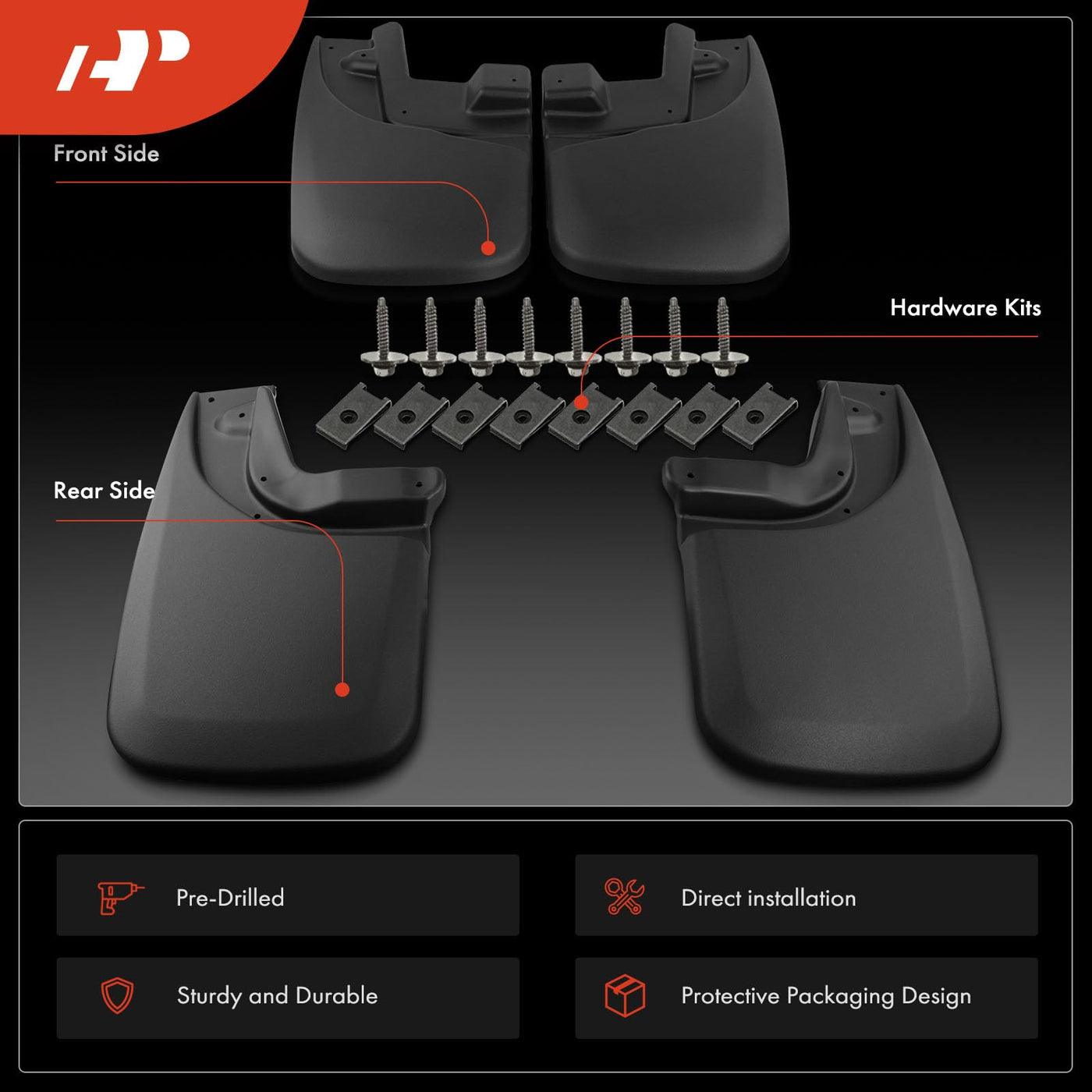 Q: How do I install these mud flaps on my vehicle?A: Installation is straightforward as these mud flaps come pre-drilled and include the necessary fitting bolts and installation hardware. They are designed for a direct-fit installation on the front and rear of your vehicle.