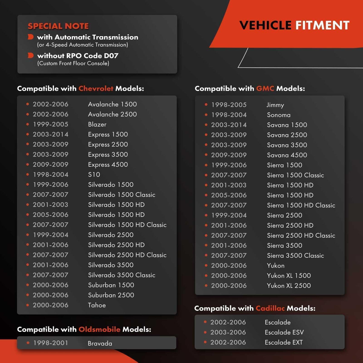 Q: What vehicles are compatible with the A-Premium Steering Column Shift Mechanism?A: The A-Premium Steering Column Shift Mechanism is compatible with a range of vehicles, including Chevrolet Silverado 1500 (1999-2006), GMC Sierra 1500 (1999-2006), Cadillac Escalade (2002-2006), and many more models from both Chevy and GMC. It fits vehicles with automatic transmissions and is designed to replace the steering column shift lever.