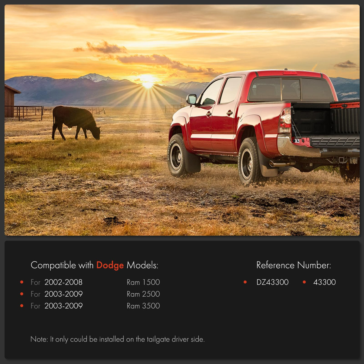 A-premium tailgate assist is an ideal choice to make the tailgate operate smoothly and safely, which is designed specifically for each make and model.All mounting hardware and installation instruction are included. With high quality standard, all the shocks come with one year quality guarantee. to high manufacturing standard, it will come with one year quality guarantee.Application:Compatible with Dodge Ram 1500 2002-2008 All Body Style Rear Tailgate Compatible with Dodge Ram 2500 2002-2009 All Body Style Rear Tailgate Compatible with Dodge Ram 3500 2002-2009 All Body Style Rear Tailgate Compatible with Item Included: Compatible with 1x Shock Compatible with 1x Cable Clip Compatible with 1x Torx Wrench Compatible with 1x Ball Mount Compatible with 1x Cable/Ball Mount Compatible with 1x Blind Nut Tool OEM Number: DZ43300, 43300Location: Left Driver SideQuantity Sold: One PieceNote: It only can be used on the driver side of tailgate.