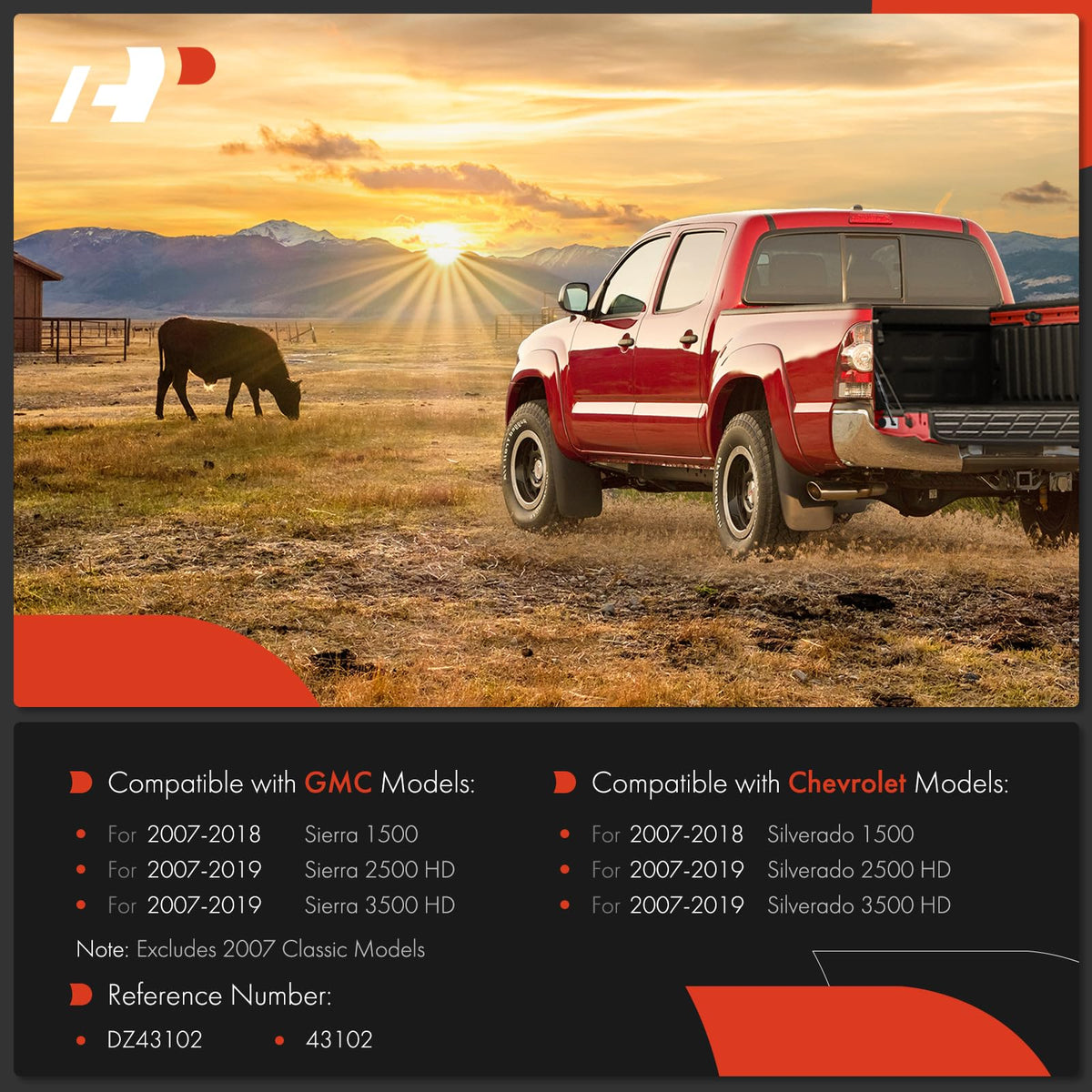 A-premium tailgate assist is an ideal choice to make the tailgate operate smoothly and safely, which is designed specifically for each make and model.All mounting hardware and installation instruction are included. With high quality standard, all the shocks come with one year quality guarantee. to high manufacturing standard, it will come with one year quality guarantee. Application: Compatible with Chevrolet Silverado 1500 2007-2018 All Body Type Rear Tailgate Compatible with Chevrolet Silverado 2500 HD 2007-2018 All Body Type Rear Tailgate Compatible with Chevrolet Silverado 3500 HD 2007-2018 All Body Type Rear Tailgate Compatible with GMC Sierra 1500 2007-2018 All Body Type Rear Tailgate Compatible with GMC Sierra 2500 HD 2007-2018 All Body Type Rear Tailgate Compatible with GMC Sierra 3500 HD 2007-2018 All Body Type Rear Tailgate Compatible with Item Included: Compatible with 1x Shock Compatible with 1x Ball Mount Plate Compatible with 1x Torx Wrench Compatible with 1x Blind Nut Compatible with 1x Blind Nut Tool OEM Number: Location: Left Driver SideQuantity Sold: One PieceNote: It only can be used on the driver side of tailgate.