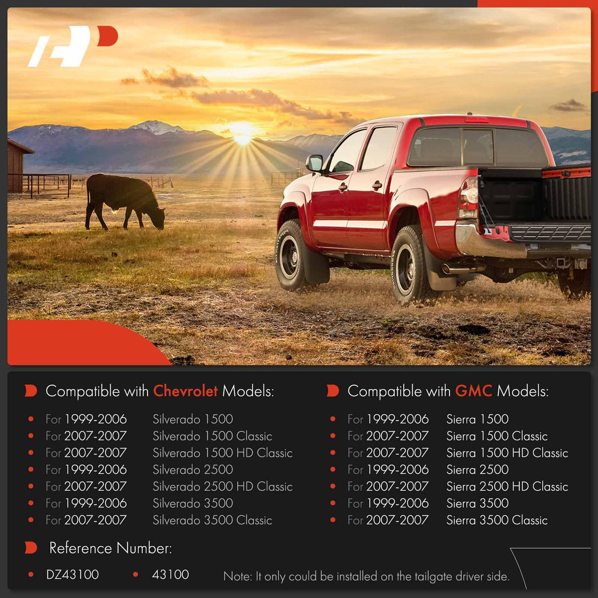 Q: What vehicles are compatible with the A-Premium Tailgate Assist?A: The A-Premium Tailgate Assist is compatible with various models including the Chevrolet Silverado 1500, 2500, 3500 from 1999 to 2006, as well as the GMC Sierra 1500, 2500, 3500 during the same years. It also fits 2007 Classic models of both Chevrolet and GMC vehicles.