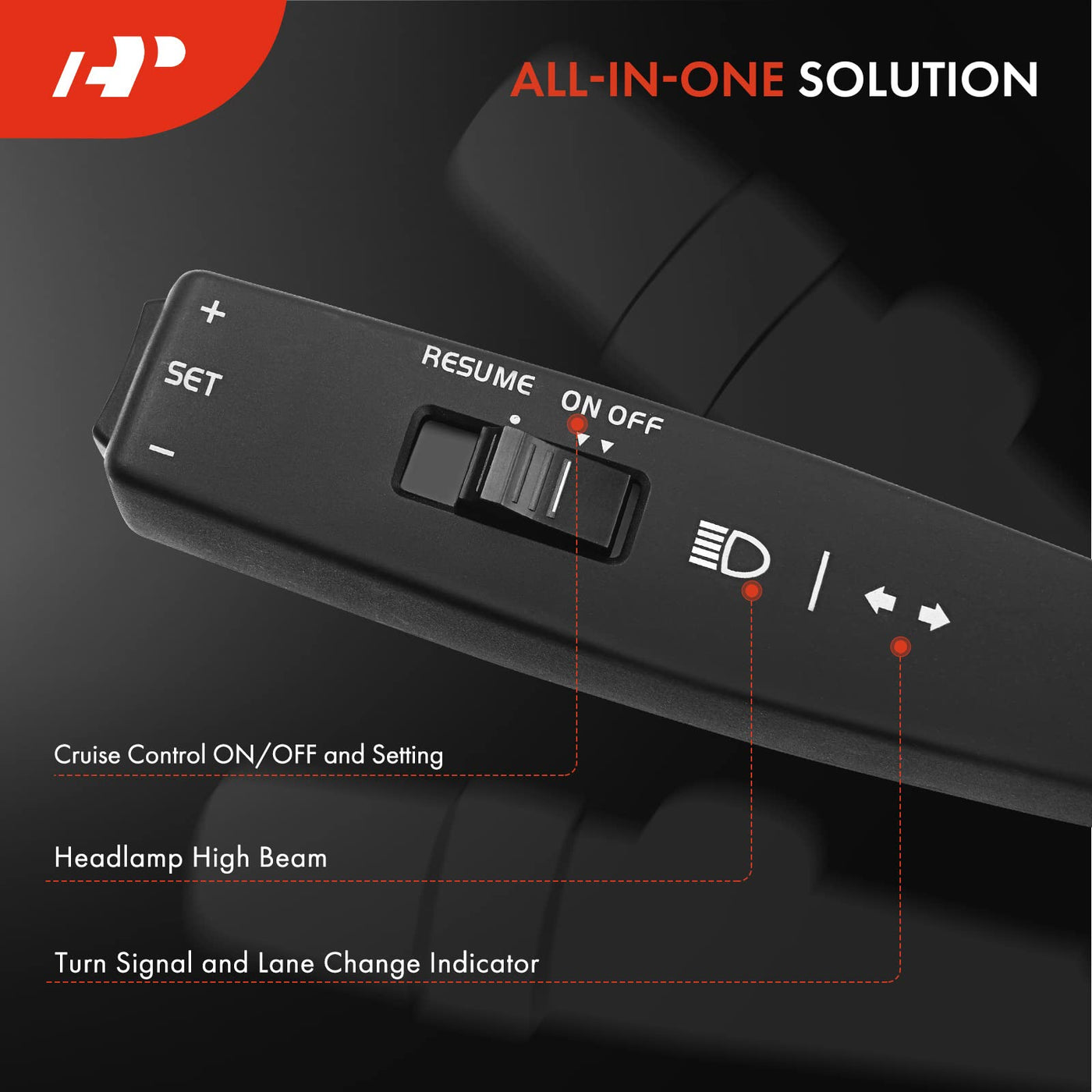 Q: What functions does the A-Premium Turn Signal Switch provide?A: This multi-function switch allows for various operations including turn signals, headlight beam changes, PTO speed adjustment, cruise control, momentary high beams flasher, latching high beams operator, and hazard lights operation.
