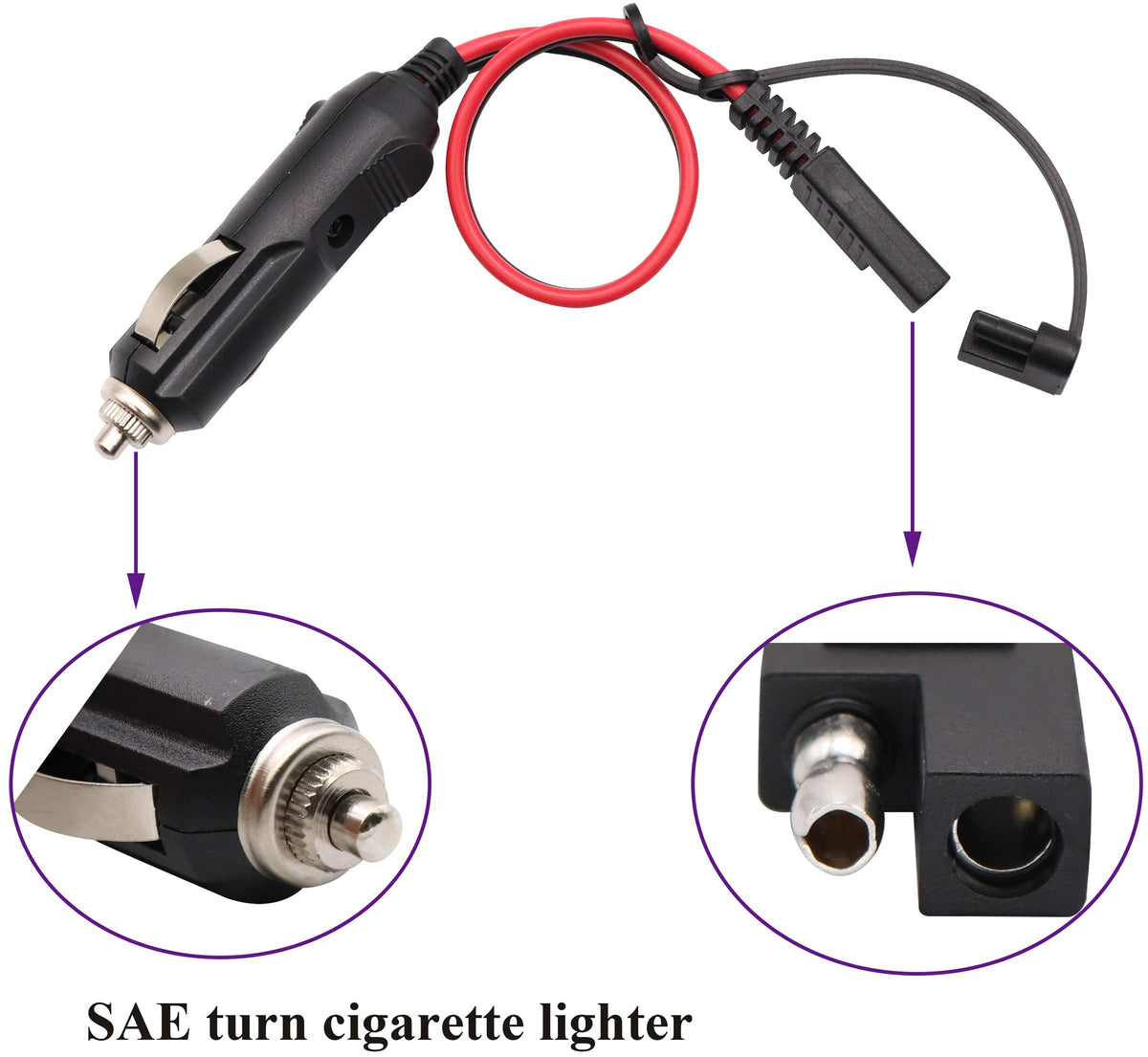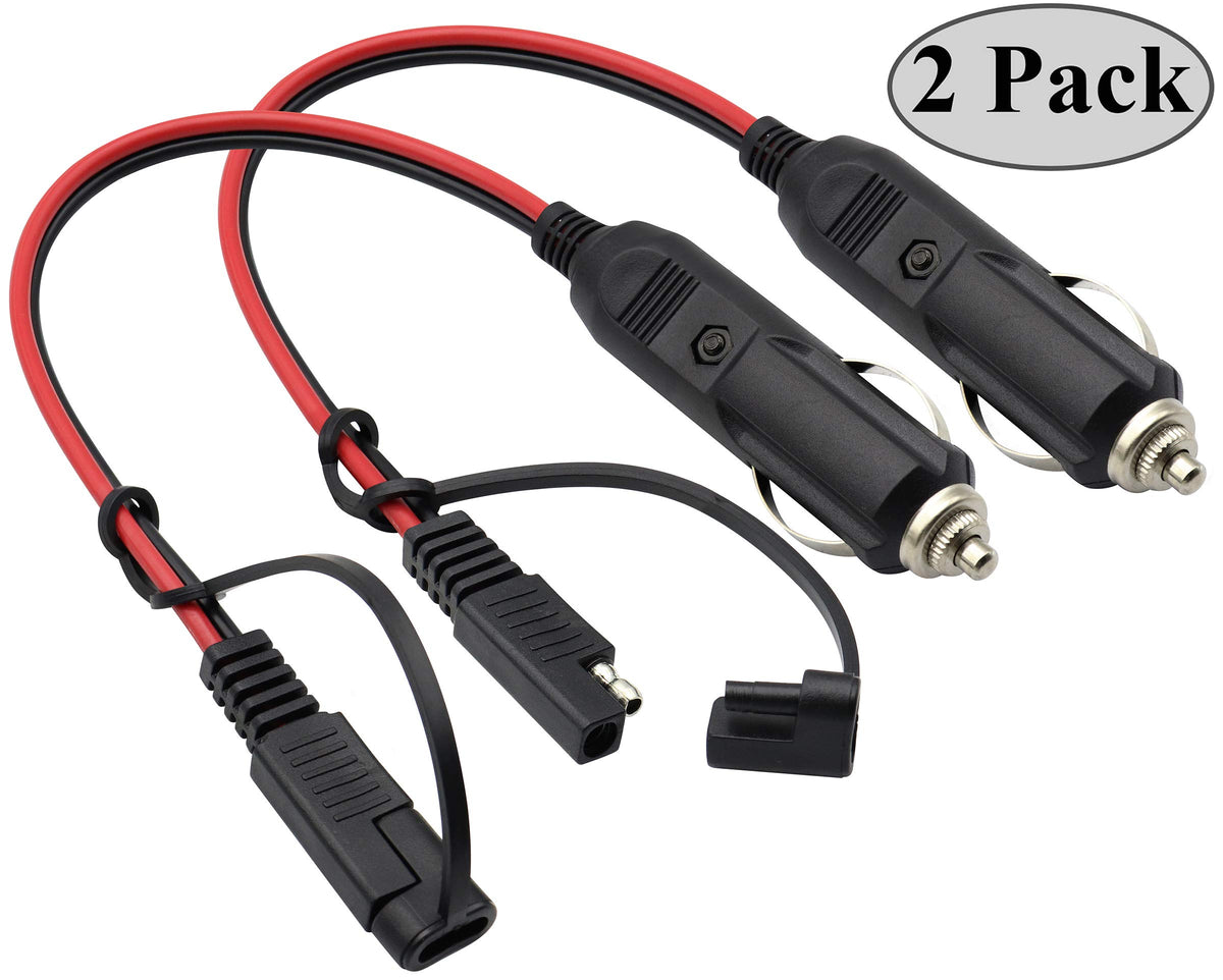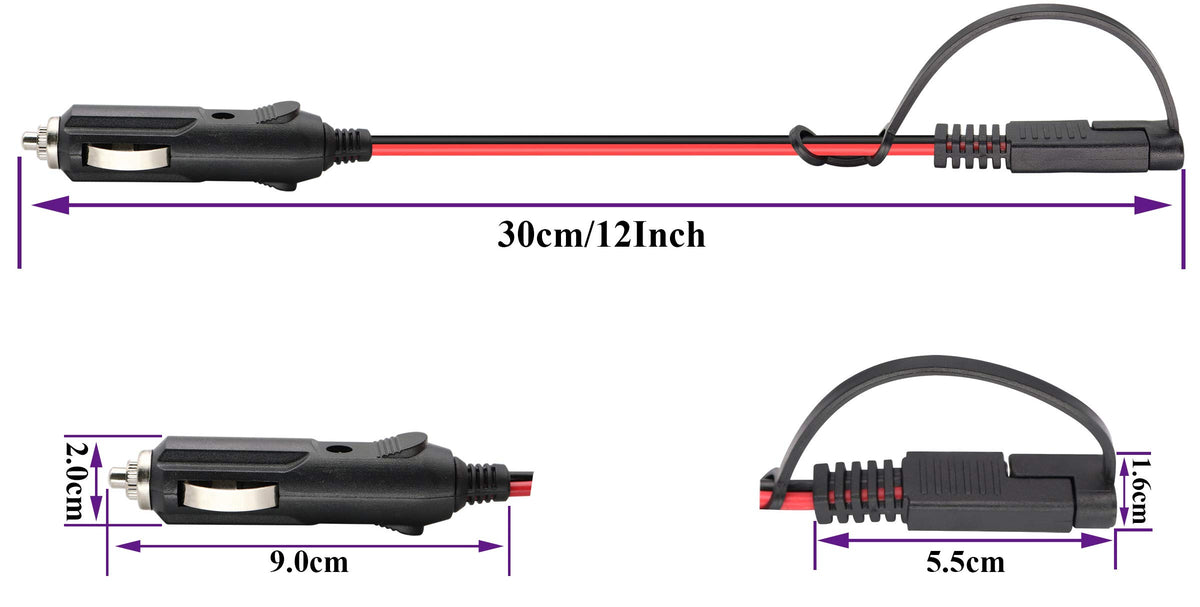 Quantity:(2-Pack) Size:Length(30cm/12inch) Color:(Red-Black) Connectors 1 : 2 pin SAE power quick connect disconnect solar jack. Connectors 2 : Connectors 1 : Cigarette lighter male jack (With Fuse) Conductor Gauge:16AWG/ 2C(Wire diameter 1.29 mm) 100% copper core cable,very thick and durable. Quick disconnect SAE connector, bullet lead design, suits for electrical wiring project, solar panel project, cars, motorcycles, RVs project and other devices you want to charge Please check your positive and negative poles of cord before place 16AWG Heavy Duty 100% Copper Wire.
