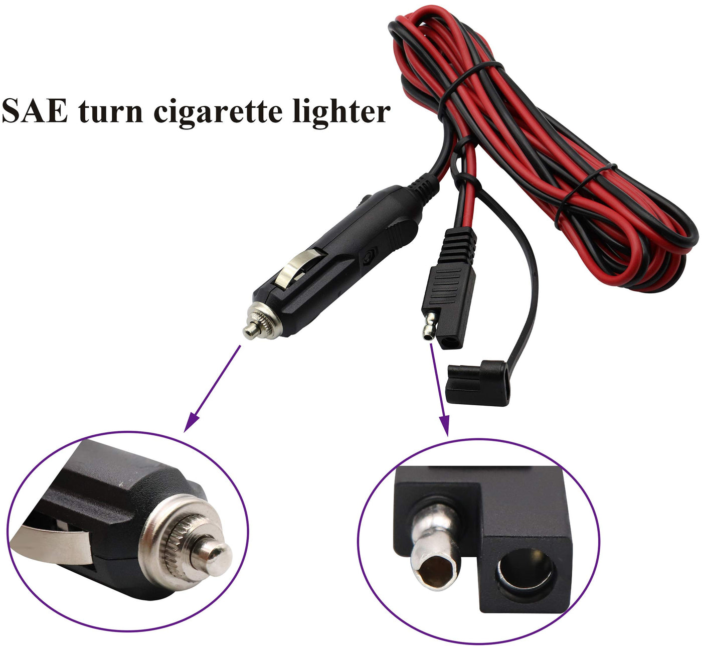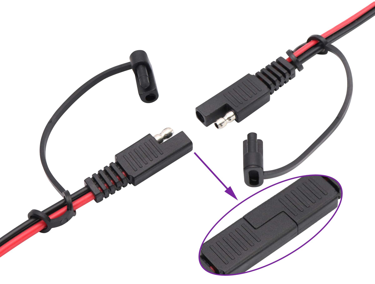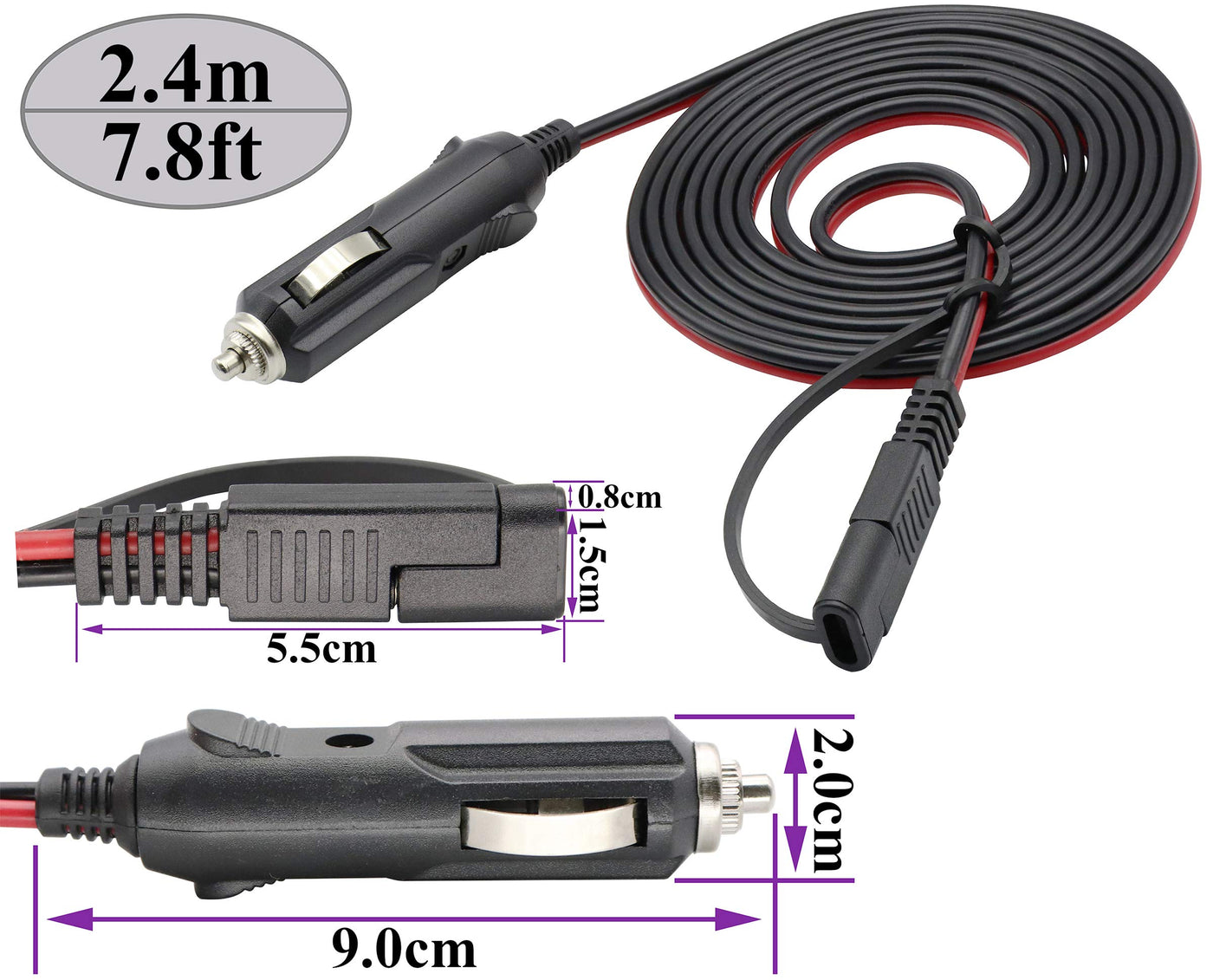 Quantity:(1-Pack) Size:Length(2.4m/7.8ft) Color:(Red-Black) Connectors 1 : 2 pin SAE power quick connect disconnect solar jack. Connectors 2 : Connectors 1 : Cigarette lighter male jack (With Fuse) (Note: No LED lights) Conductor Gauge:16AWG/ 2C(Wire diameter 1.29 mm) 100% copper core cable,very thick and durable. Quick disconnect SAE connector, bullet lead design, suits for electrical wiring project, solar panel project, cars, motorcycles, RVs project and other devices you want to charge Please check your positive and negative poles of cord before place 16AWG Heavy Duty 100% Copper Wire