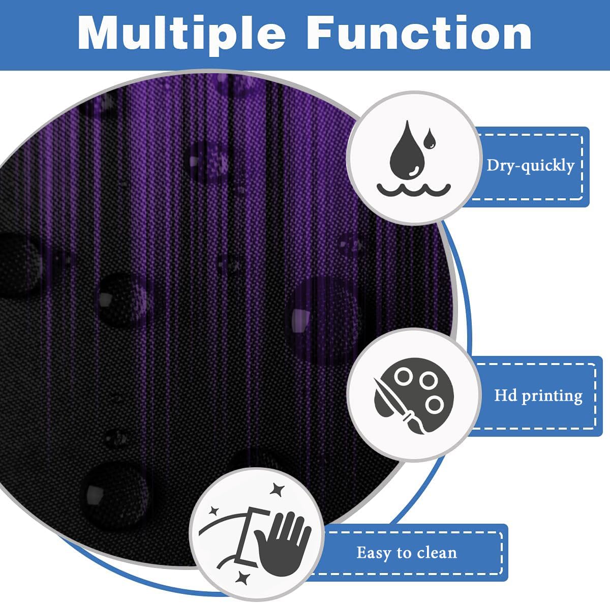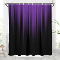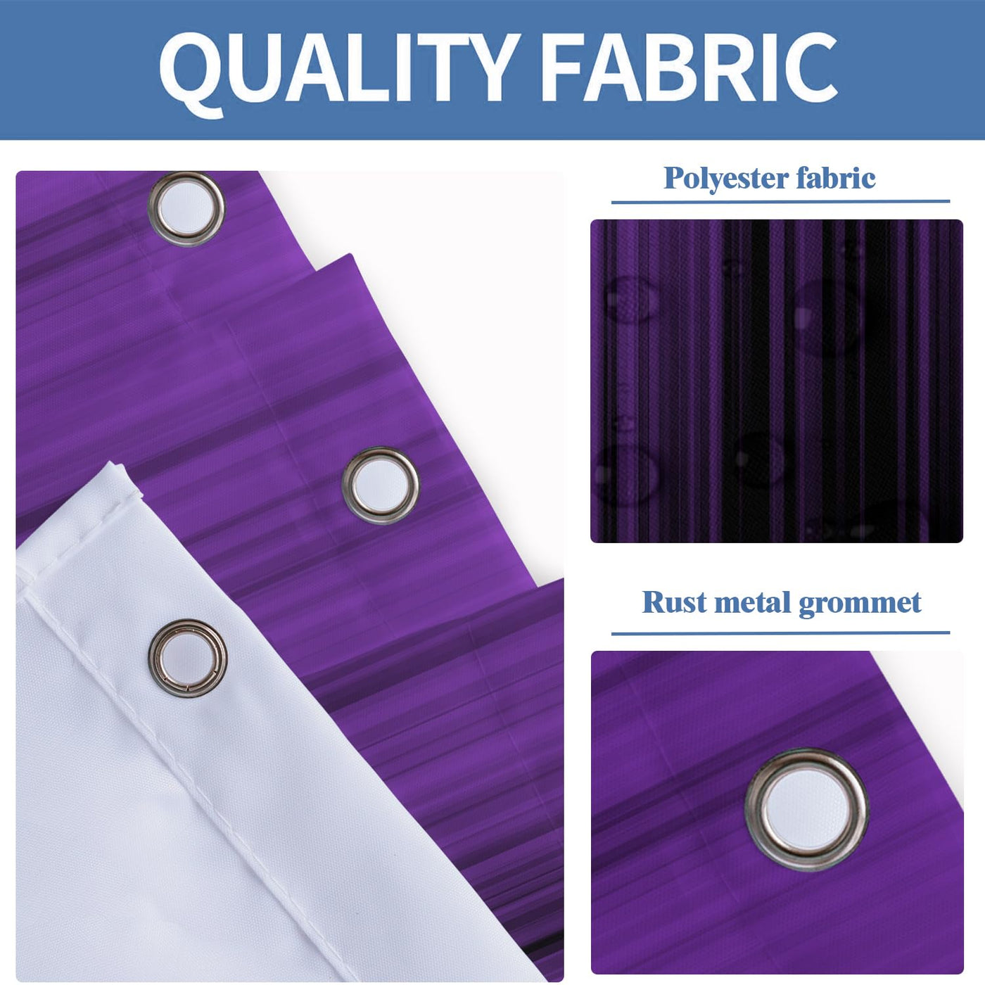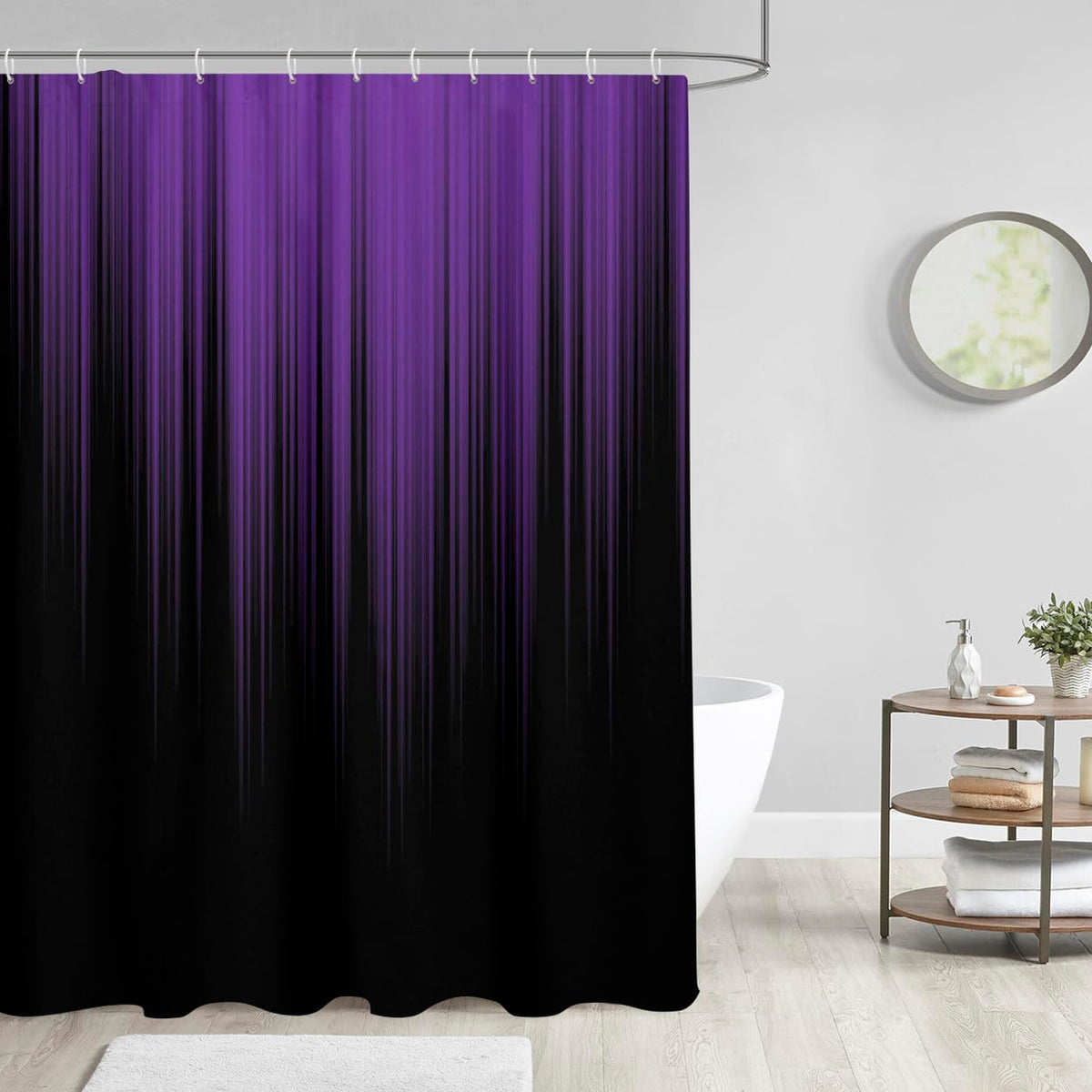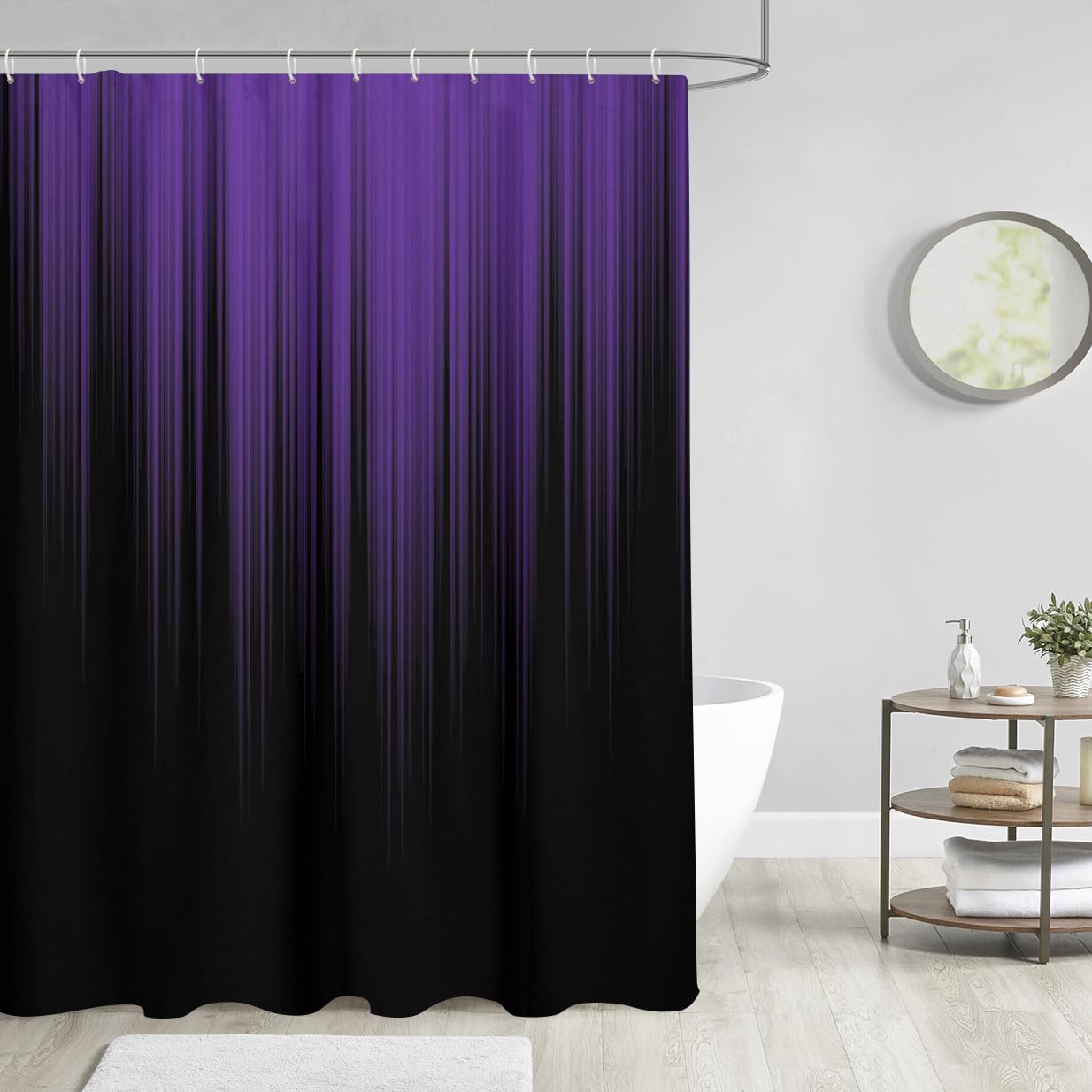 Q: Is the design of the shower curtain suitable for a specific theme?A: The ombre abstract striped geometric design in purple and black offers a modern and artistic touch, making it suitable for Gothic, anime, or contemporary bathroom decor themes.