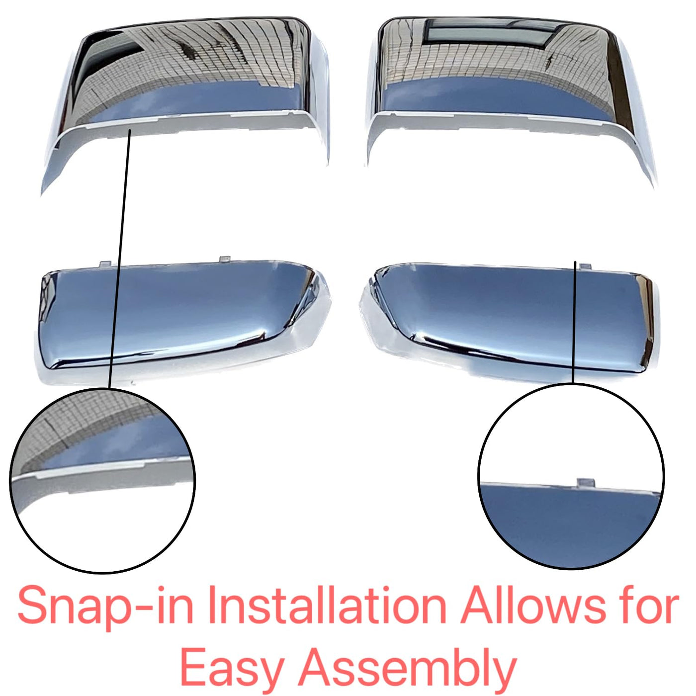 Q: How easy is it to install the towing mirror cover caps?A: Installation is very simple and can be done with a 'Clip-On' method. Just remove your old mirror caps and clip the new ones into place without any modifications required.