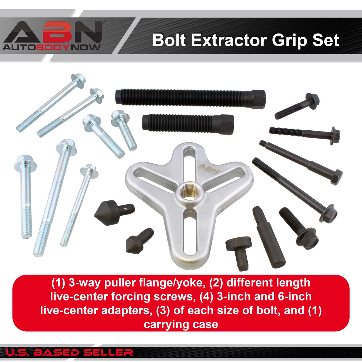 Q: How durable is the ABN Bolt Grip Set?A: This tool set is built to last, featuring a forged 3-way puller flange construction and grade 8 hardened steel bolts, providing maximum strength and longevity for all your pulling needs.