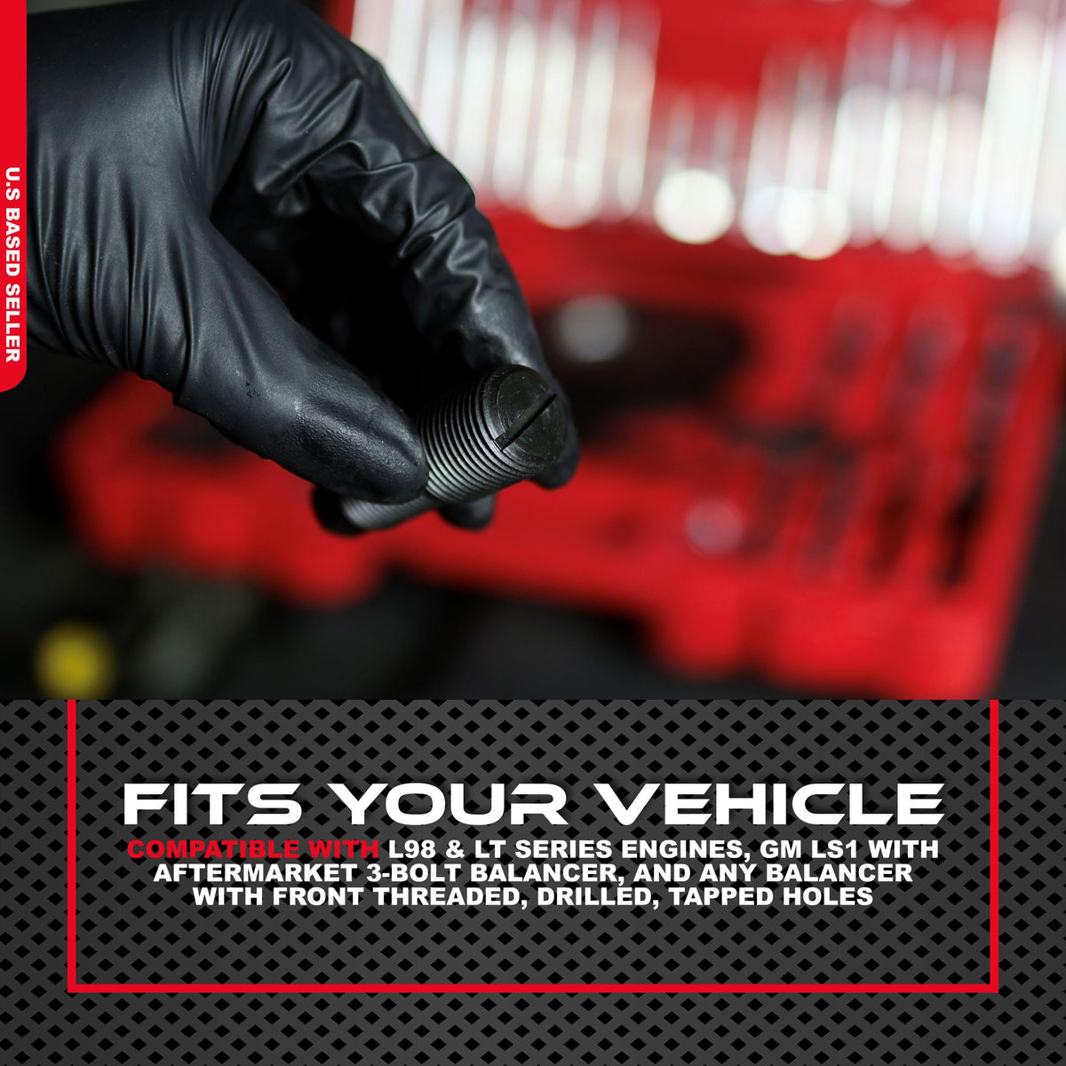 Q: Is this harmonic balancer puller compatible with different engine models?A: Yes, this harmonic balancer puller is designed for use with various engine models, including L98 & LT series engines, GM LS1 with aftermarket 3-bolt balancers, and any balancer featuring front threaded, drilled, or tapped holes.