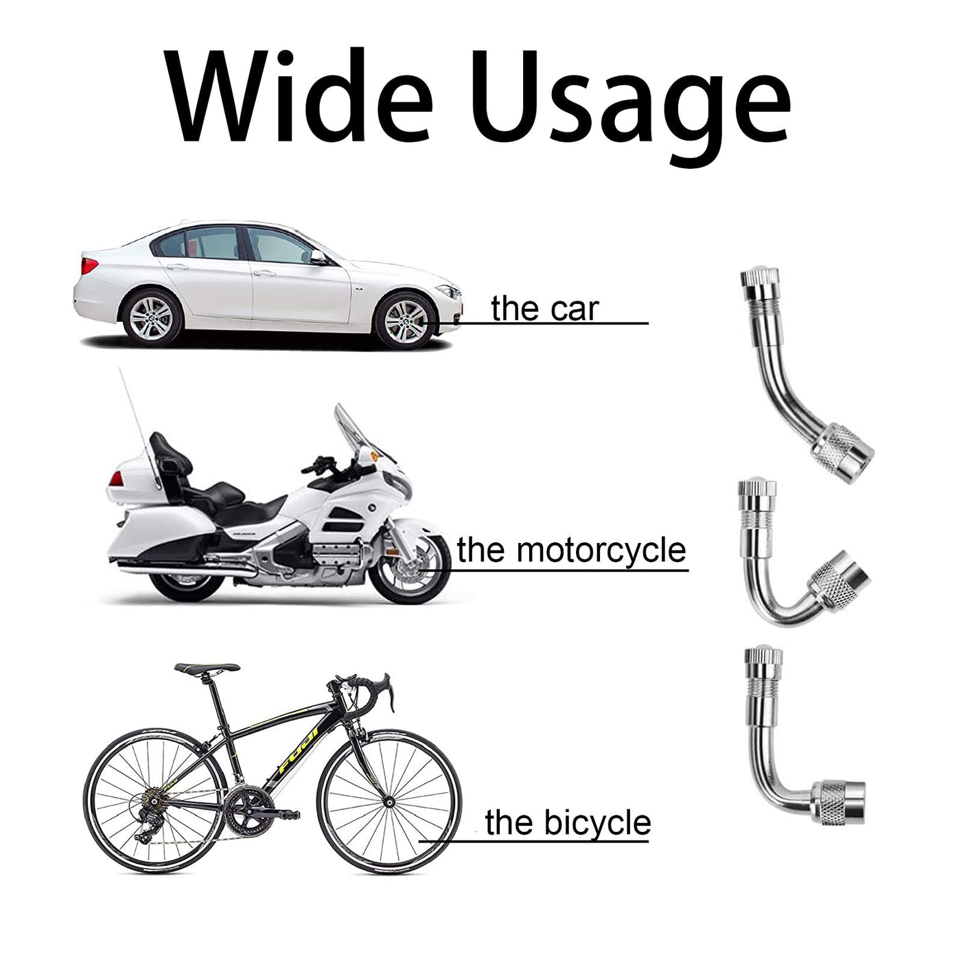 Q: What vehicles are compatible with the ACCRETION valve stem extenders?A: The ACCRETION valve stem extenders are designed to be universally compatible with most vehicles, including RVs, passenger cars, trucks, motorcycles, trailers, bicycles, and recreational vehicles that have standard American tire valves.