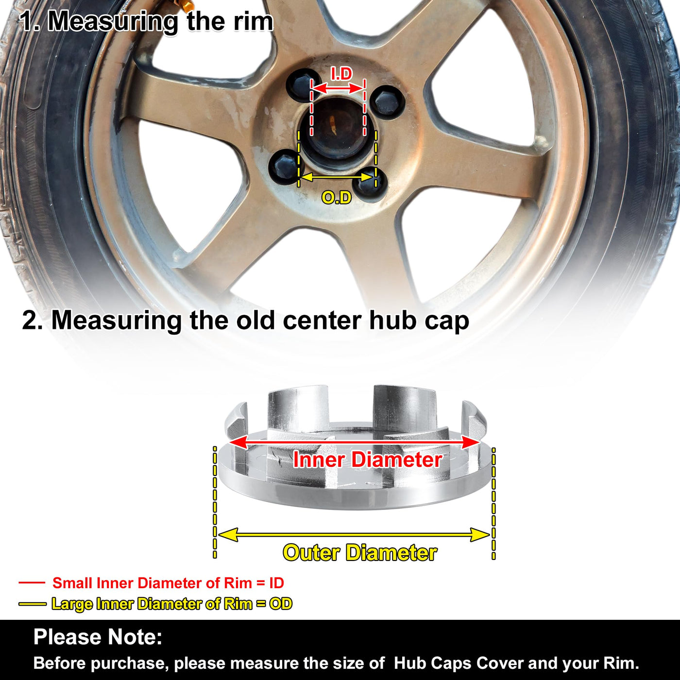 Features:Simply install, insert directly and fix the lugs.Suitable for front or rear wheel center hubs.Fittings: directly click into place after removing your old caps.Specification:Color: Silver ToneMaterial: PlasticSticker Diameter: 50mm/1.97''Clip Length: 3.5mm/0.14''Outer Diameter: 53mm/2.09Inner Diameter: 48mm/1.89Dimension: 13x53mm/0.51x2.09(H*D)Package Includes:4 Pcs Wheel Hub Center CapsNote: Please Check your wheel cap size and rim hole size and compare with our wheel caps. The diameter of the Rim inner circle = outside diameter of hub cap base, Diameter of Rim Outer circle = maximum outer diameter of the hubcap. The Clip length=Wheel steel thickness. (Tolerance value: +- 0.5mm); Before measuring, clean the center hole of the wheel hub and use a caliper to measure after removing debris.