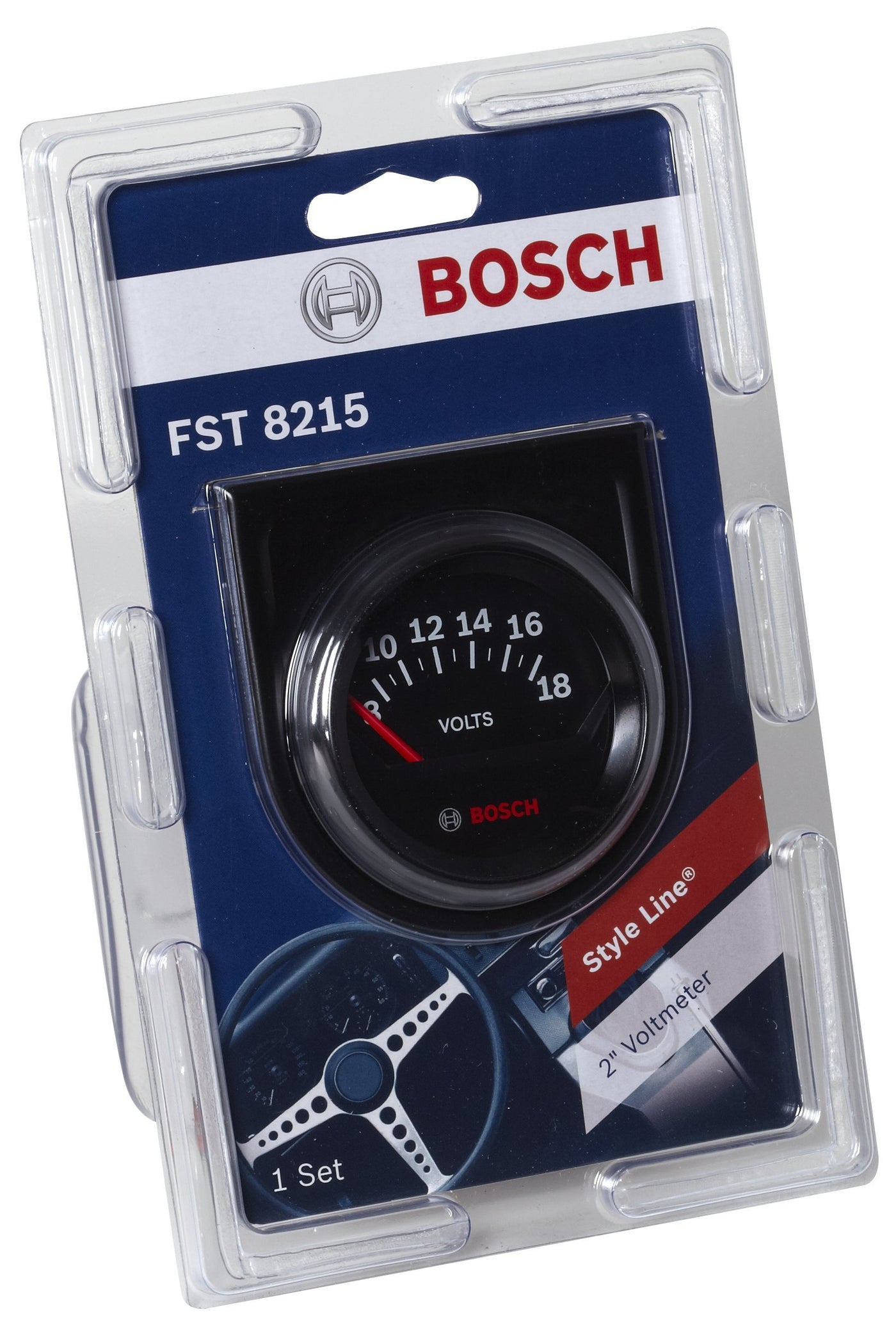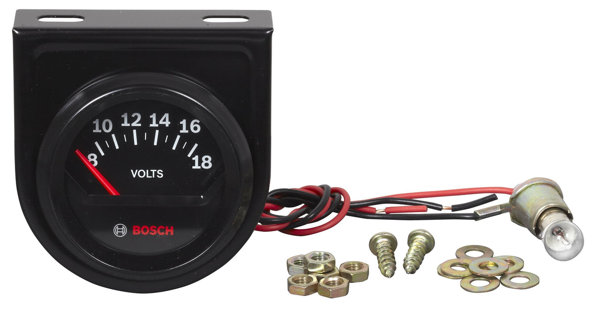 The Bosch SP0F000051 is a Style Line 2'' Electrical Voltmeter Gauge. It features a range of 8 to 18 volts with a 60 degree sweep. Requires hook up wire. The gauge is a standard 2'' black dial for a 2-1/16'' opening and features a chrome bezel with removable chrome mounting panel. Includes mounting hardware and 12 volt internal back lighting. Only for 12 volt negative ground systems. The Style Line features a clean easy to read look with a bright pointer against a white or black background. Bosch is known for precision, engineering, and innovation. Add style and you have the first-ever line of Bosch gauges, including replacement tachometers, speedometers, temperature and pressure gauges for all applications. Bosch Branded Gauges represent the latest in design following our 100+ year history of Automotive, Industrial, and Racing products.