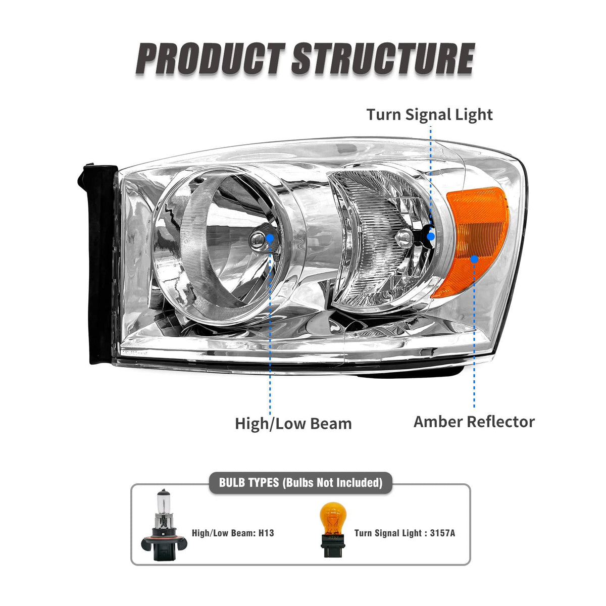 Description: It Is Time To Change Your Headlights Assembly!!! Why Waste So Much Money On The Car Maintenance Shop? You Just Need A New Pair Of Headlights, And Your Car Will Look New Again.Designed Compatible With 2006 2007 2008 Dodge Ram 15002006 2007 2008 2009 Dodge Ram 2500 3500 (Original Headlights Must Be Without Amber Colored Bar)Oem Equivalent Part Number: 68003125Aa/68003124Aa Partslink:Ch2502180/Ch2503180 Condition: New Color:Chrome Housing Amber Reflector Package Include: Driver & Passenger Side Certifications: Dot,Sae (Attention)This Product Does Bulb Type: H13 For Both High Beam And Low Beam (Not Include) Problems And Solutions 1.Have Your Car Headlights Been Dimmed By Abrasion From Road Debris? 2.Factory Headlights Not Bright Enough? 3.Headlights Became Yellowish And Discolored From The Sun And Elements? Old:A Dim, Cloudy, Yellowed, Damaged Or Non-Functioning Headlight Makes Driving Dangerous. New:New Headlights Make Your Car Look Brighter, And Give You And Your Family Safer Nighttime Driving. See Farther. See Wider. See Better A New Pair Of Headlights From Adcarlights Allows You To See Farther Down The Road At Night And In Any Bad Weather That May Arise.