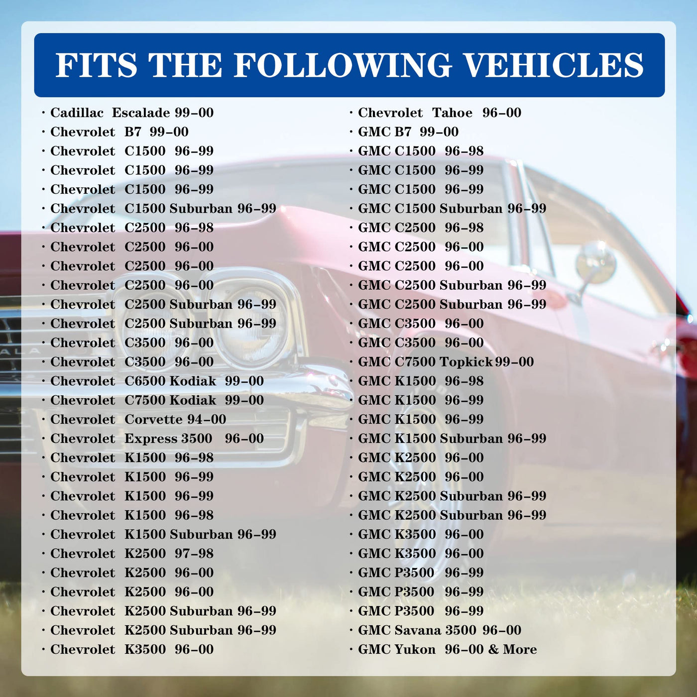 Q: What vehicles are compatible with the AdvanEX Mass Air Flow Sensor?A: The AdvanEX Mass Air Flow Sensor is compatible with a wide range of vehicles, including the 99-00 Cadillac Escalade, 94-00 Chevrolet Corvette, 96-99 Chevrolet C1500, 96-00 Tahoe, 96-00 Yukon, and 93-02 Pontiac Firebird, among others. Always double-check your vehicle's specifications for a precise fit.
