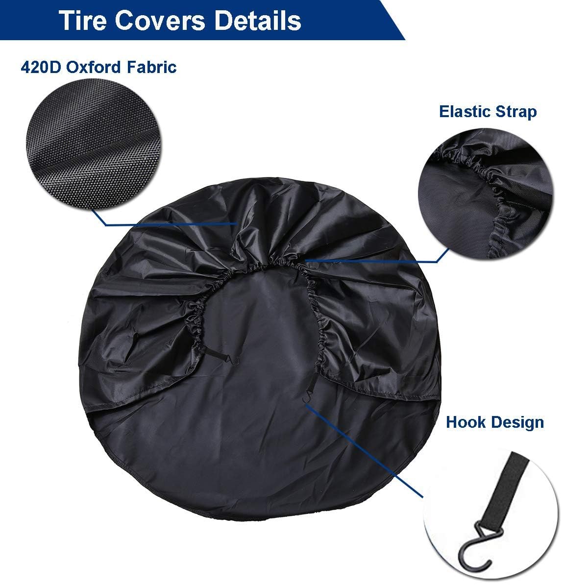 About Our Tire Cover - Premium Quality Durable water resistant with UV stabilized treatment, long-lasting and tough enough as a tire cover, bonded with soft, non-scratch backing. - Fits 24 to 26 Tire Sizes Can be used for RV, Motorhome, Horse Trailer, Travel Trailer, Utility Trailer, Camper, Van, Truck, Jeep, Tractor and so on.Holding up to the windy snow Winter and blocking the hot Summer. About Tires or Wheels The tires left exposed to the harmful sun and other environmental hazards when your vehicle park in the outdoor and very unfortunately, they will deteriorate much faster than you might think and could potentially lead to on-road blowouts as well as costly replacement.More serious may have security risks. Specification: Material:Oxford Cloth + Plastic Hooks Color:Black Size: Tire Diameters: 24 - 26 (60cm - 66cm) Tire Width: 10.6 (27cm) Package Included:4pcs tire covers How to Calculate and Choose the Right Tire Cover for You? If your tire is written with 235 75R/15 Tire diameter=235*75/500+15*2.54=73.35cm 73.35cm in the range of 68cm - 74cm Then you can choose the size 27-29 for your tire. Note: Please measure before purchasing and the measurments should be from the ground up. If you have any question about our product, please feel free to contact us!