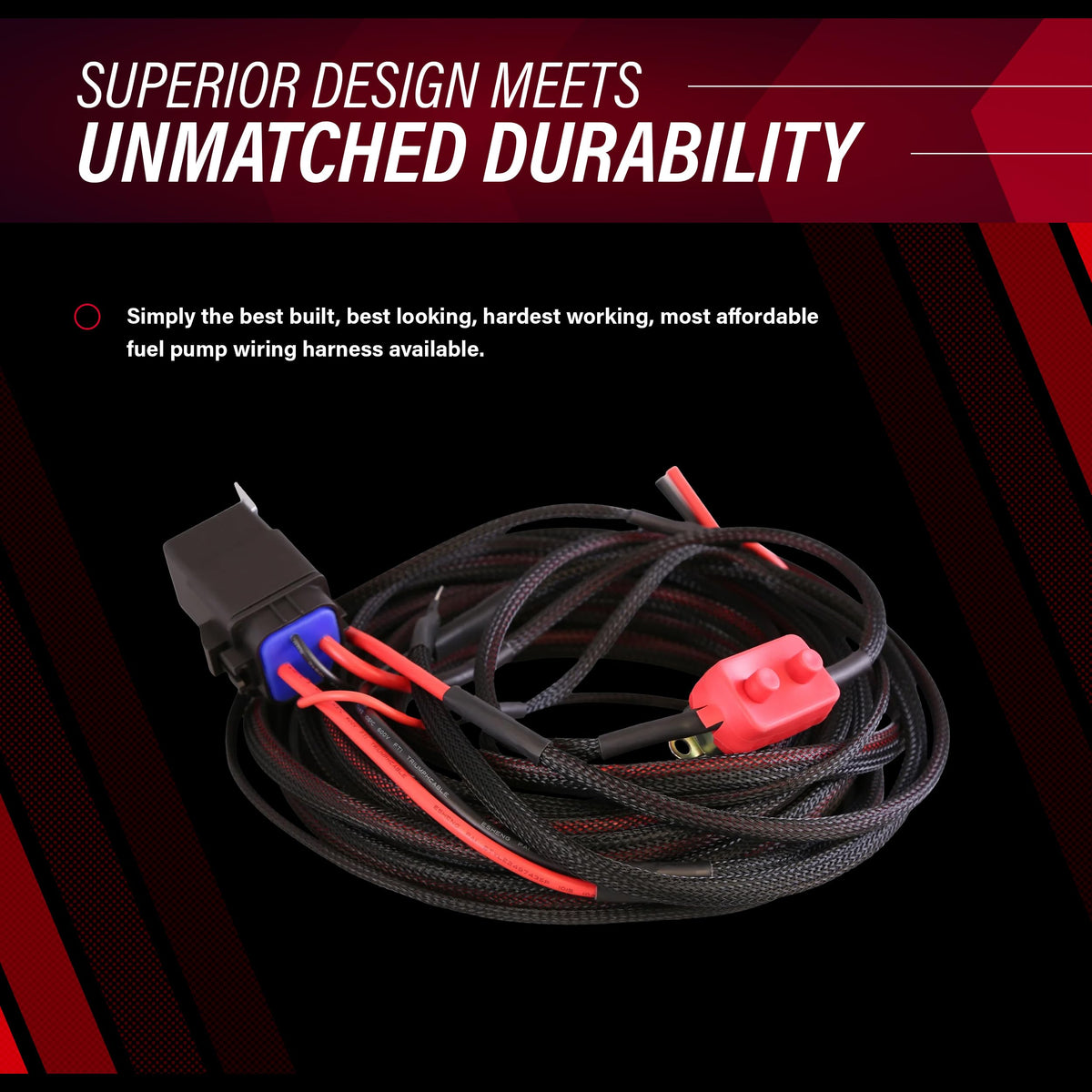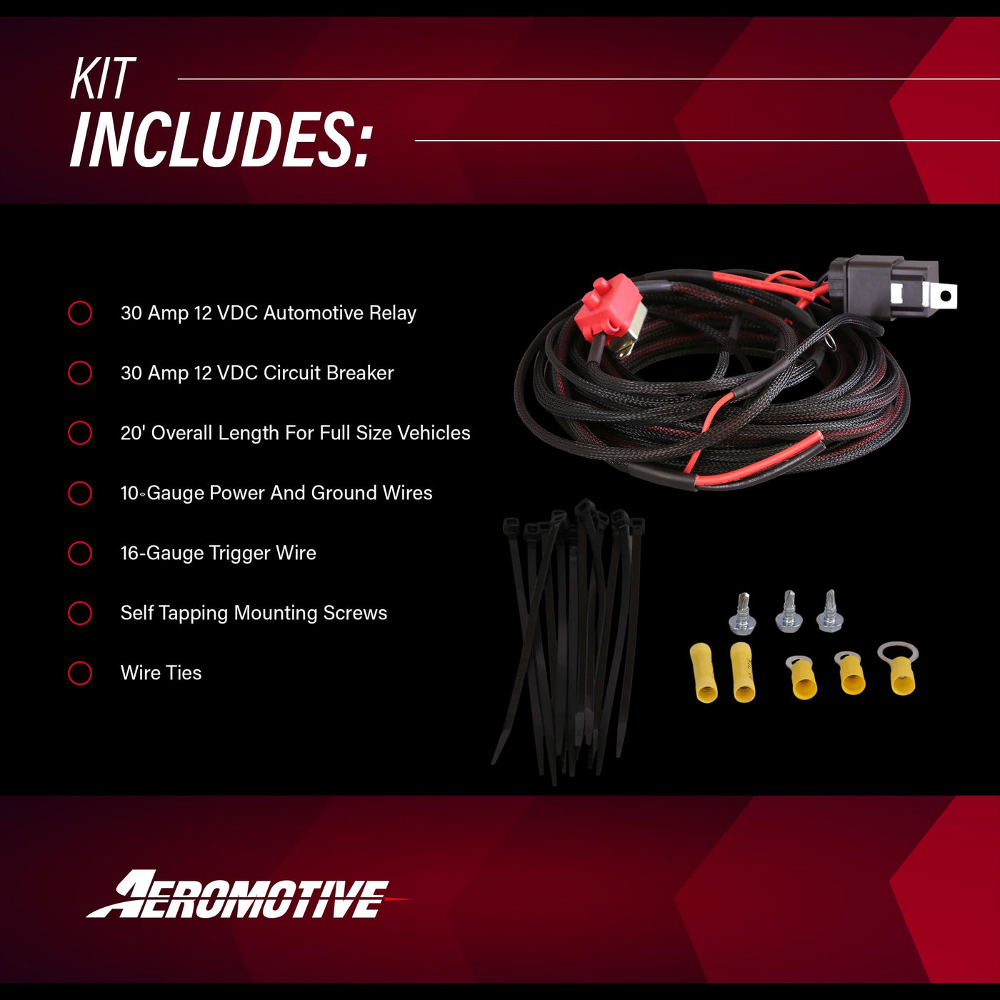Ensure reliable and efficient operation of your high-performance fuel pump with our meticulously designed fuel pump wiring harness kit. Ideal for Aeromotive electric fuel pumps and compatible with both brush and brushless models up to 3.5 Spur-Gear, this fuel pump wiring kit is essential for anyone looking to enhance their vehicle's fuel system capabilities. Featuring a robust 30-amp, 12 VDC automotive relay and a matching 30-amp circuit breaker, our kit delivers exceptional power handling and safety, protecting against electrical overloads and ensuring consistent fuel delivery. The 20-foot total length of 10-gauge power and ground wires provides ample reach for installations in full-size vehicles, allowing flexible setup options from front to rear. This fuel pump wire harness kit not only simplifies the installation process with 70% pre-terminated looms but also includes self-tapping mounting screws and wire ties to secure your setup neatly. Whether upgrading your race car or street vehicle, our wiring kit ensures that your fuel pump operates at peak efficiency, with stable power and precise control.