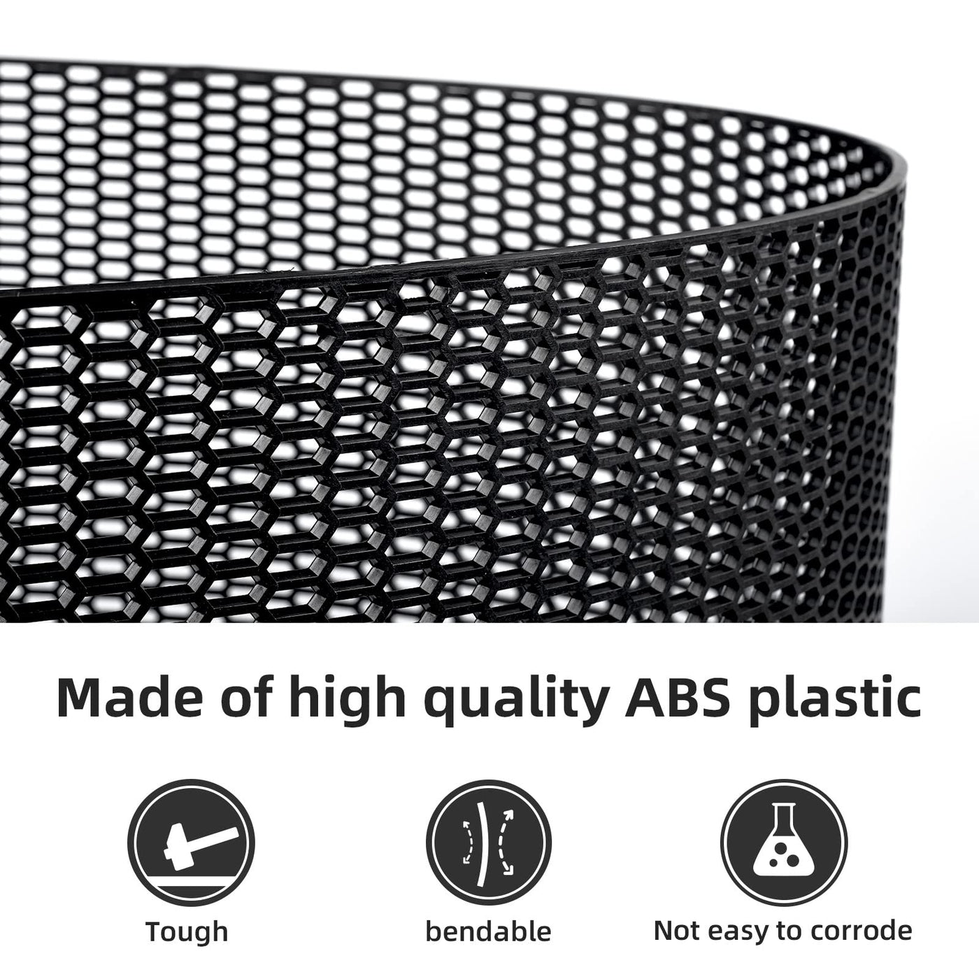 Feature: Made of ABS plastic and durable use. Soft but durable, easy to cut and install, perfect for custom grille inserts Universal Fit for any bumper, body kit, fender, hood vent, vehicle opening etc. Protect your intercooler, radiator, and engine bay from road rocks, debris, garbage, leaves, etc. Allowing air to pass by and keep the engine running cool. Specification: Color: Black Material: ABS Plastic Size: 47 x 16inch/ 120 x 40cm Hole size: 7x15mm Package Included: 1x Car grill mesh