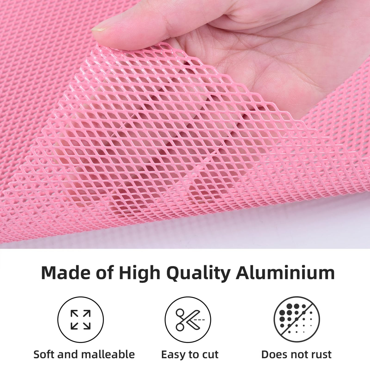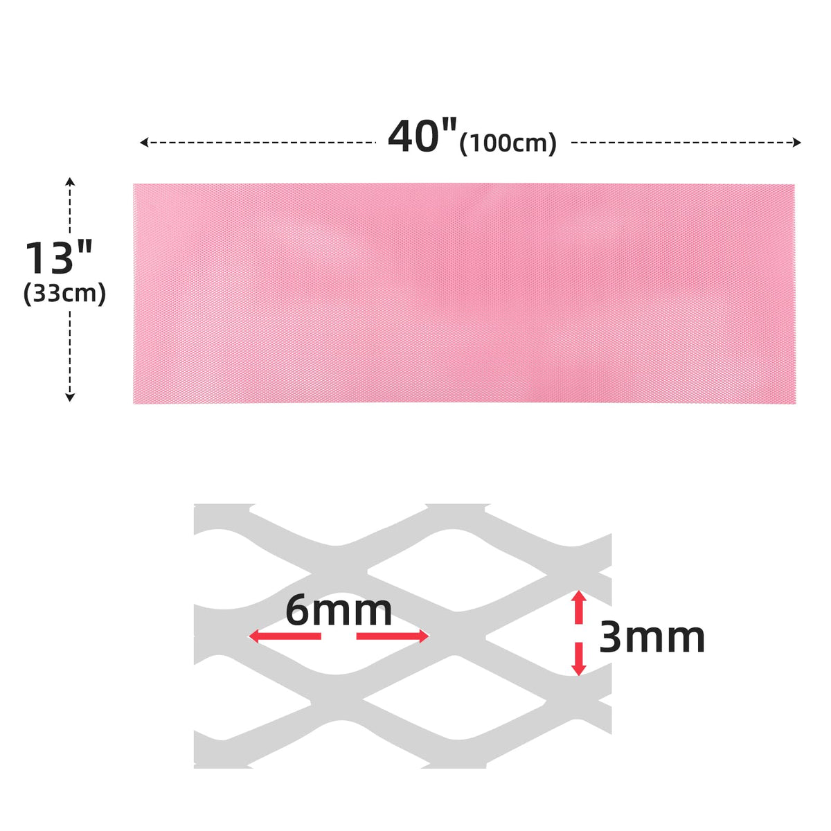 Feature: Made Of Aluminium Alloy And Durable Use. Soft But Durable, Easy To Cut And Install, Perfect For Custom Grille Inserts Universal Fit For Any Bumper, Body Kit, Fender, Hood Vent, Vehicle Opening Etc. Protect Your Intercooler, Radiator, And Engine Bay From Road Rocks, Debris, Garbage, Leaves, Etc. Allowing Air To Pass By And Keep The Engine Running Cool. The Grill Mesh Can Be Bent And Molded Into Different Shapes. Specification: Color: Pink Material: Aluminium Alloy Size: 40 X 13Inch/ 100 X 33Cm Hole Size: 3X6Mm Installation Method: 1. Prepare The Corresponding Tools, Such As Large Sharp Scissors, Tin Snips, Saws, Sanders, Wire Cutting Scissors, Wire Cutters, Etc.; 2. The Grill Mesh Is Cut According To The Shape Of The Mid-Net Frame, It Is Best To Leave A Certain Space Size, In Order To Adjust Conveniently; 3. Saw Off The Grid Of The Original Grill Mesh, Leaving Only The Middle Net Frame, And Cover The Middle Net After Cutting And Grinding; 4. Use Steel Wire, Wire Buckle, Or Glass Glue (The Kind That Sticks To The Front Windshield) To Fix It. If You Use Glass Glue, You Have To Be Equipped With A Hot Air Fan To Enter The Operation. Package Included: 1X Car Grill Mesh
