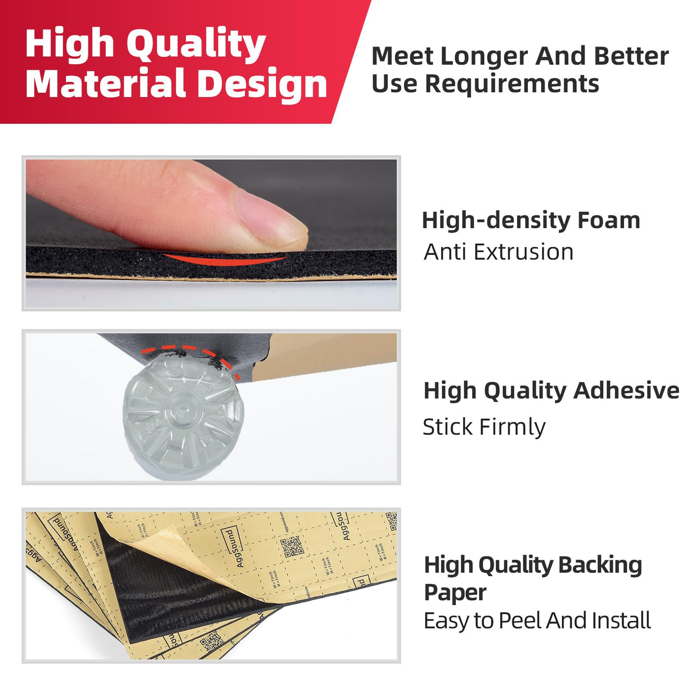 [4mm High Quality Closed Cell Foam, Provide Better Sound & Heat Insulation] Our automotive sound deadener is composed of three layers of high quality material, including 4mm high density closed cell foam, high quality back glue and back paper. It provides better noise insulation effect for your car so you can enjoy a more quiet and comfortable environment. At the same time, it effectively reduces 98% heat transfer. [High-quality Material, Meet the Needs of Longer & Better Use] 10mm thickened foam has a higher anti-extrusion function compared with inferior foam product, so there is no need to worry about the collapse of the use process. Excellent adhesive has strong viscosity, which can ensure to stick firmly. High quality back paper is easy to to peel & install and not easy to tear. [Equipped with High-quality Practical Tools, Ensure Convenient Installation & Insulation Effect] We also specially equip you with adequate aluminum foil tape and car trim removal tool. Removal tool is more resistant than the market tools, you can easily pry the door without worrying about leaving scars. Also, you can use aluminum foil tape for the junction of two heat insulation or corner edge, allowing you a better sound deadener effect and not to worry about falling off of heat insulation. [Easy to Install, Wide Application] Aggsound heat shied pad is convenient in installation and operation. Just five steps can be completed: disassemble-clean-cute-paste-reinstallate. 4mm unviersal thickness is more suitable for the car door, hood, trunk, floor, firewall and other parts of the vehicle. You do not have to worry about the phenomenon of not being able to install because the thickness is too large but the vehicle gap is not enough.