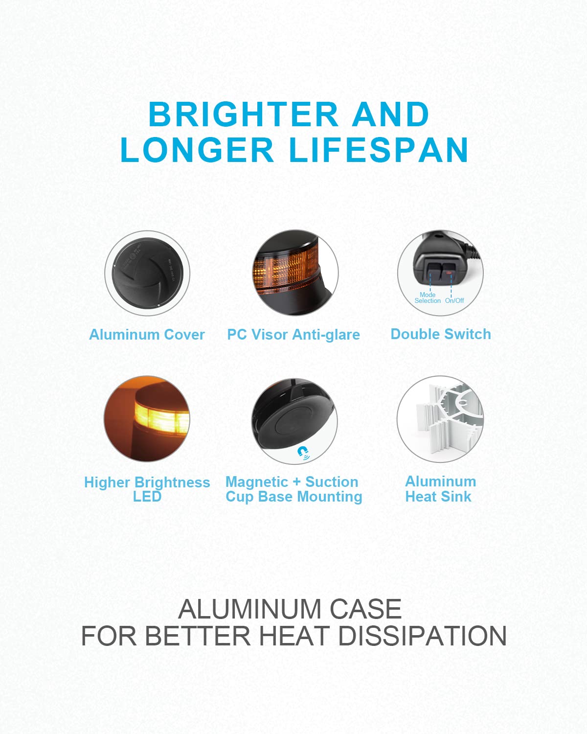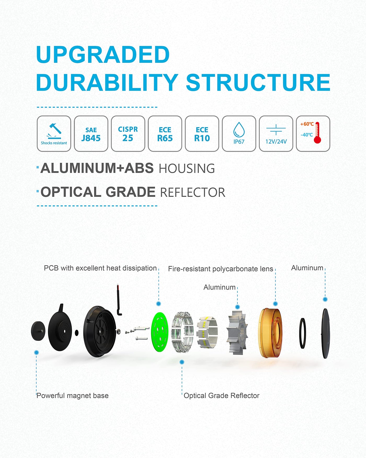 Youre Safer with Us. Every product produced by AgriEyes is built by a professional and experienced 15 person engineering team. Each design takes months or even years to study optical, structural etc., it uses the least energy consumption to achieve the highest efficiency conversion, making the design and product structure perfectly meet the market demand. We are looking forward to work with you to make our market unique and irreplaceable. Specifications: 4.2 inch Magnetic Strobe Beacon Light Power: 19W Operating Voltage: 12-24V and more Color: Amber Seven Built in Flash Patterns: 1.Single Flash 2. Double Flash 3.Three Flash 4. Counterclockwise Slow Rotation (480ms) 5. Clockwise Slow Rotation (480ms) 6. Counterclockwise Fast Rotation (300ms) 7. Clockwise Fast Rotation (300ms) Working Temperature: -40 ~ 65 deg ree Celsius. Dimension: Long 4.3 x Width 4.3 x Height 2.2 . Net Weight:0.92lb Protection Rating: IP67 Material: ABS Base, PC Lens. Charging port: DC 12V Working Life: Over 50,000 hours. Charge and discharge protection. Certified by SAE J845, ECE R65, ECE R10, CE & RoHs. Packing Including: 1PC 4.2 inch Flashing Lights for Vehicles 1 x Car charging cables If you have any questions, you can contact us and we will reply you within 24 hours.