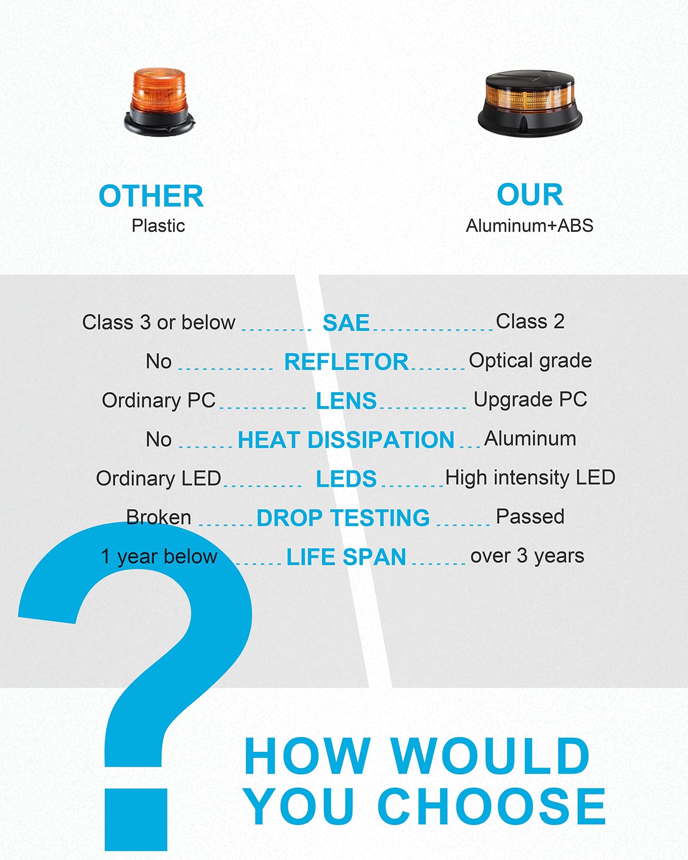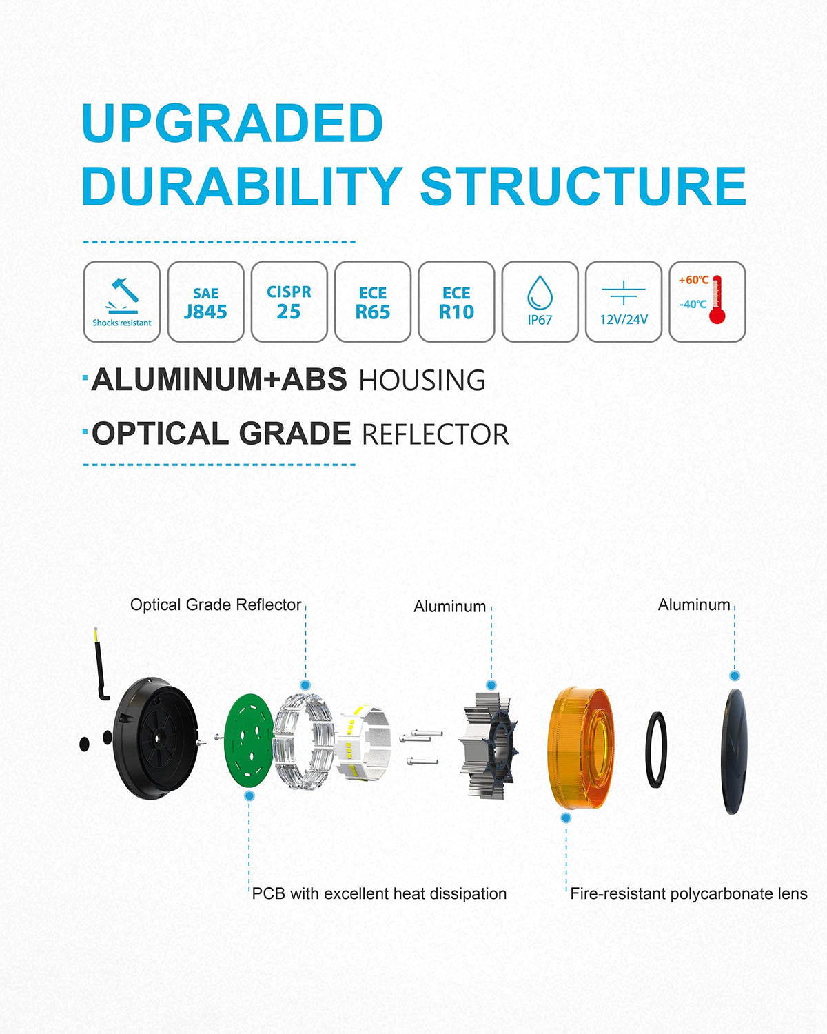 Youre Safer with Us. Every product produced by AgriEyes is built by a professional and experienced 15 person engineering team. Each design takes months or even years to study optical, structural etc., it uses the least energy consumption to achieve the highest efficiency conversion, making the design and product structure perfectly meet the market demand. We are looking forward to work with you to make our market unique and irreplaceable. Specifications: 4.2 inch Mini Strobe Beacon Light Power: 19W Operating Voltage: 12-24V and more Color: Amber Seven Built in Flash Patterns: 1.Single Flash 2. Double Flash 3.Three Flash 4. Counterclockwise Slow Rotation (480ms) 5. Clockwise Slow Rotation (480ms) 6. Counterclockwise Fast Rotation (300ms) 7. Clockwise Fast Rotation (300ms) Working Temperature: -40 ~ 65 deg ree Celsius. Dimension: Long 4.25 x Width 4.25 x Height 1.85 . Net Weight:0.62lb Protection Rating: IP67 Material: ABS Base, PC Lens. Charging port: DC 12V Working Life: Over 50,000 hours. Charge and discharge protection. Certified by SAE J845, ECE R65, ECE R10, CE & RoHs. Packing Including: 1PC 4.2 inch Mini Strobe Light 1 pack of Screw Accessories If you have any questions, you can contact us and we will reply you within 24 hours.