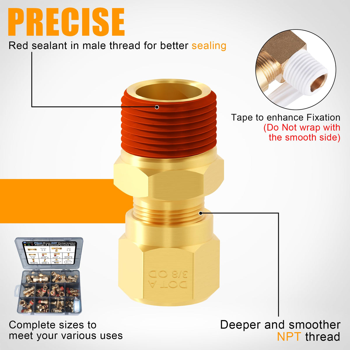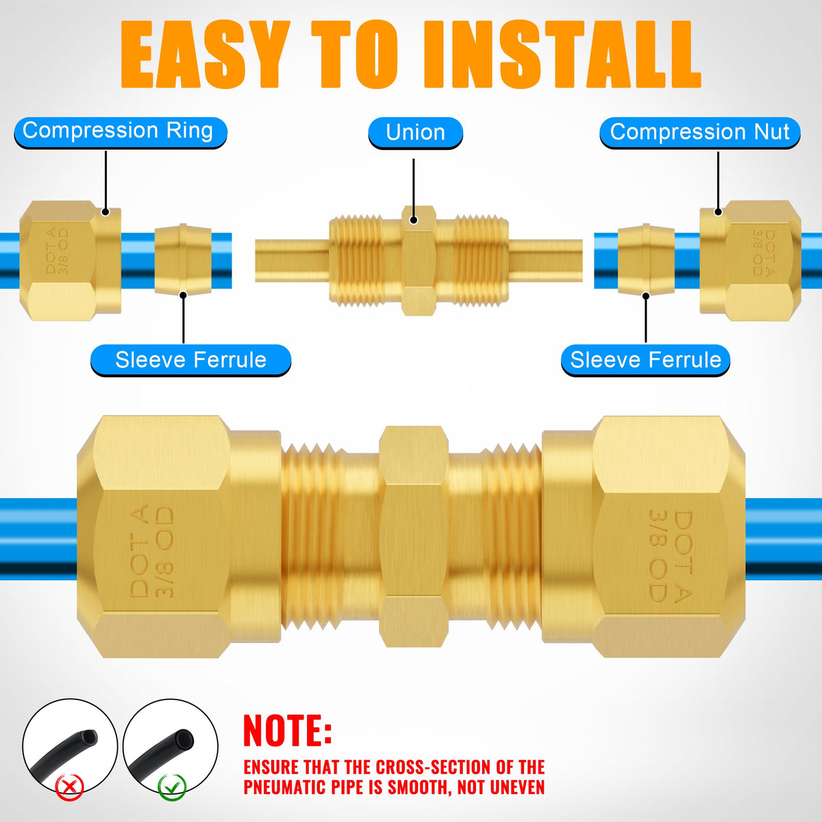 Dot Fittings Set: The Dot Air Brake Fittings Kit Package Includes 74Pcs: 13Pcs Union Connectors,5Pcs Tube Tees,10Pcs 90°Elbows Npt Thread,4Pcs 45°Elbows Npt Thread,10Pcs Straight Male Connectors Npt Thread, 4Pcs Hex Bushing,2Pcs Schrader Valve,26Pcs Sleeves Ferrules,1Pc 4M Teflon Tape.Premium Material: Our Dot Air Brake Fittings Are Made Of High-Quality Ca360 Brass, Meet D.O.T Fmvss 571.106, Air Brake System Requirements, With Corrosion Resistance, High-Temperature Ductility, And Low Permeability. Great For Long-Time Use, Dot Air Brake Fitting Type: 1/8',1/4',3/8',1/2',5/8'.Pressure Range: Air Line Fittings Pressure Resistance, Not Easy To Trip. Air Brake Fittings Working Pressure From Vacuum Max To 300 Psi. Temperature Range: -65° F To +200° F(Note: See Tubing Manufacturer’S Recommendations For Pressure And Temperature Mutations).Easy To Install: Our Dot Air Fitting Kit Quicks Disconnect Push Tubing In, You Need To Use Tools To Fix Loose Parts To Handle In Tight Places So That Use Will Be Firmer And Not Easy To Fall Off. And Pieces That Contain A Threaded End Already Have Sealant Pre-Applied To Provide A Secure Connection.Typical Application: Air Brake Fittings Assortment Kit Can Be Used With Air Systems, Copper Tubing In Airline Brake Systems, Which Is Perfect For Automotive Car Or Truck Repair, Air Operated Seats, Operating Gauges, Air Horns, Industrial Workshops, Air Brake Connections, Towing Machine Hose Connection And Air Brake Connections Or Lawn Mower Repair.