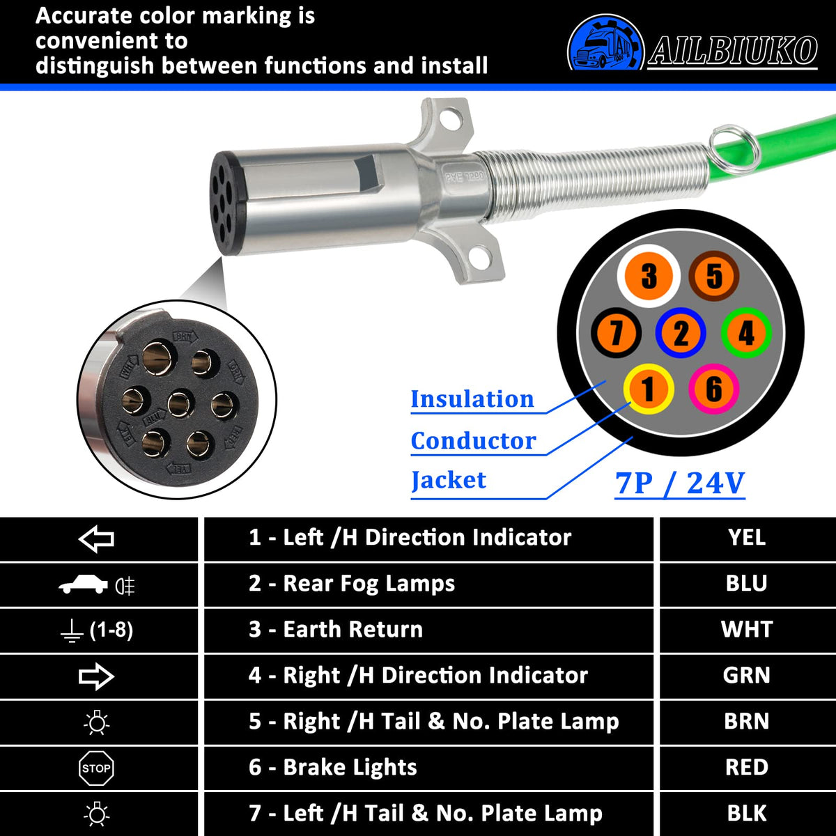 Q: How does the 7-way plug enhance the performance of the electrical cable?A: The 7-way plug, made from industry-standard zinc die-cast, allows for efficient power transmission from the engine to the trailer or truck. It utilizes high-quality copper for excellent thermal and electrical conductivity, ensuring reliable operation of lights like turn signals and brake lights during driving.