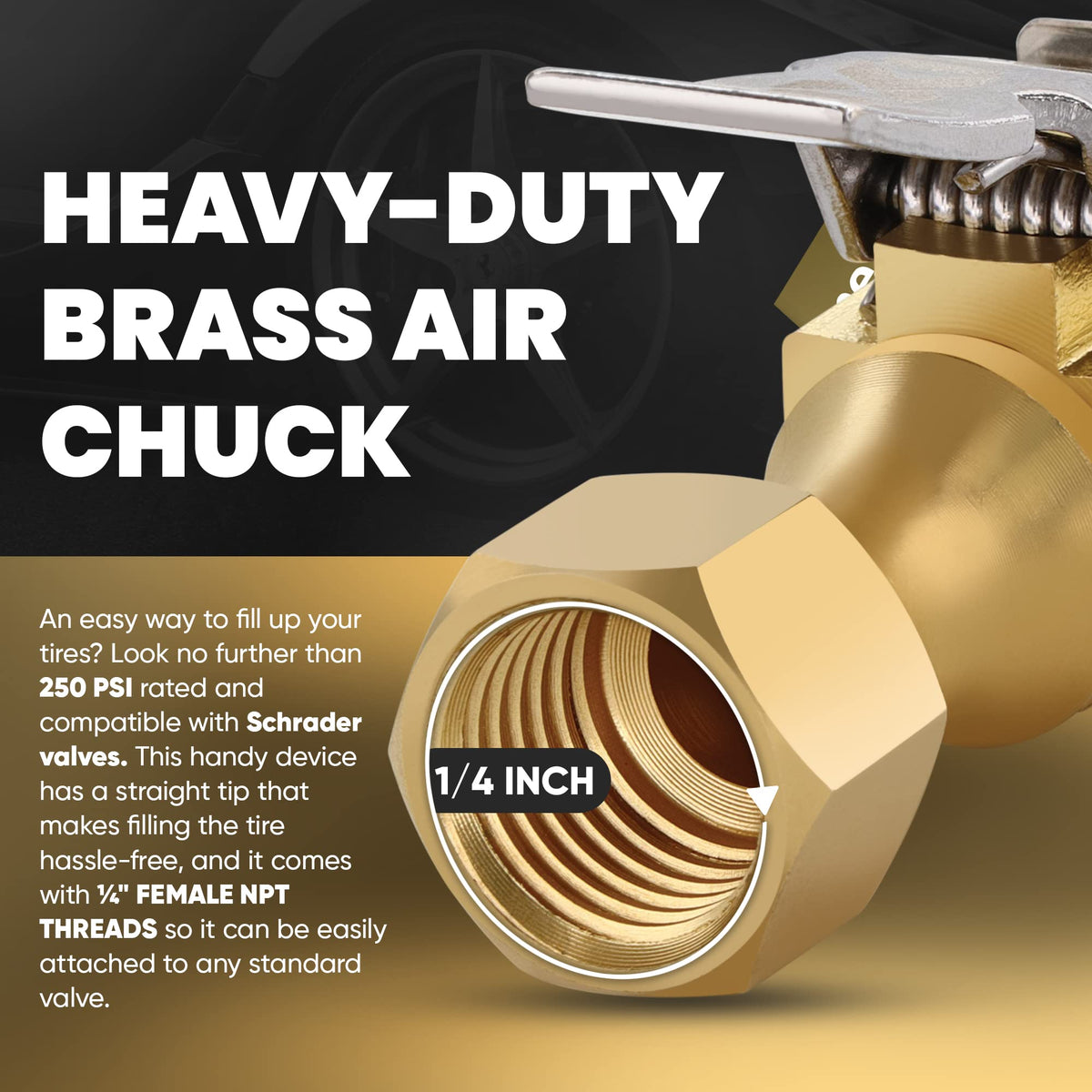 Air Chuck, Closed Flow Heavy-Duty Locking Tire Air Chuck, With Quick Connect, Solid Brass, 1/4 Inch Female Npt Thread, 250 Psi, Fits Most Air Hose, Air Inflators, - 2 In A Pack