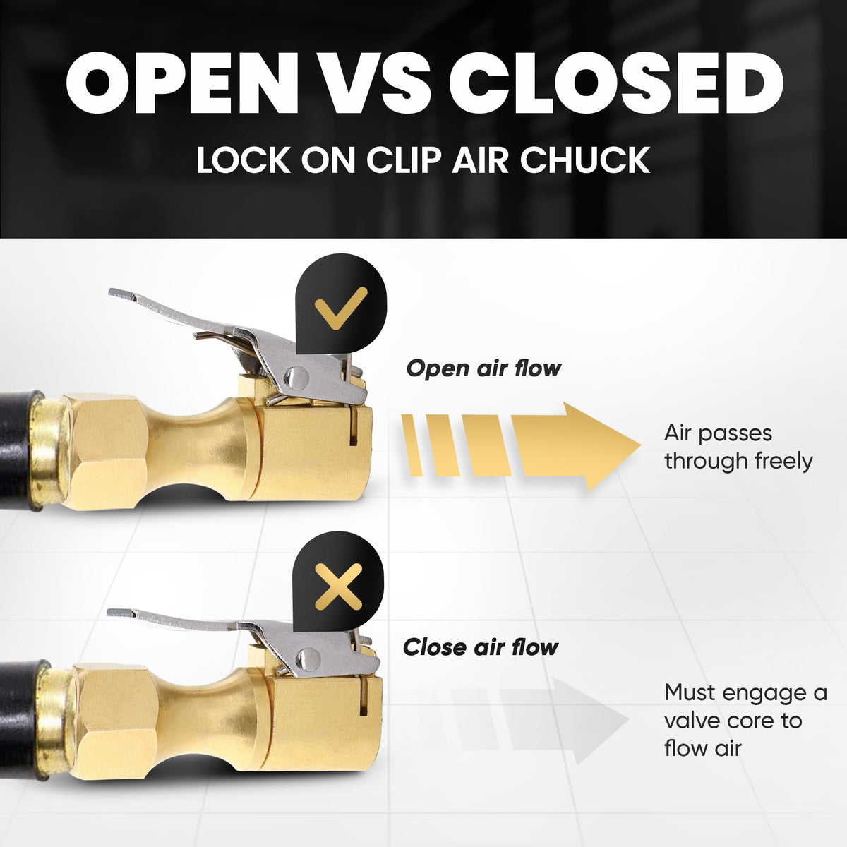 Choose the air chuck that best suits your needs. Closed flow air chucks connect directly to the air compressor line and will allow air from the compressor into the tire after securing it to the valve stem. Open flow air chucks will constantly enable air to pass as long as the air compressor runs.