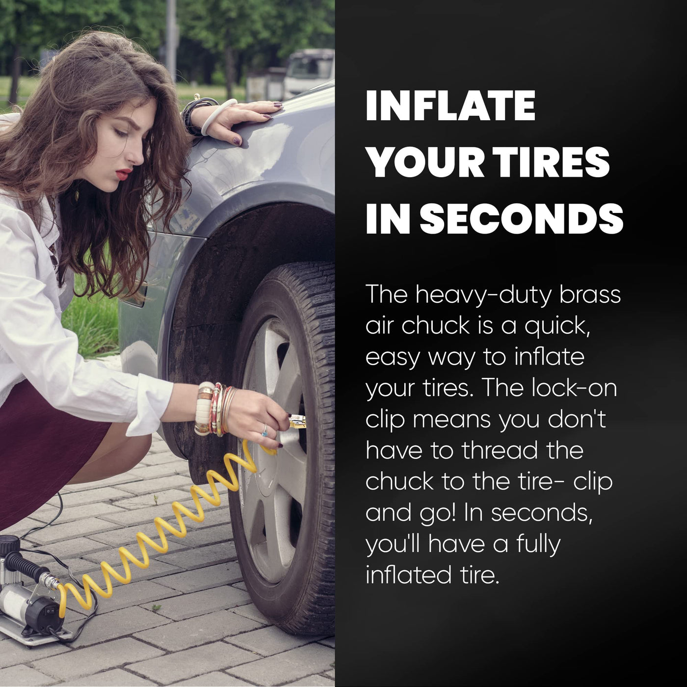 LOCKING AIR CHUCK - QUICKLY & EASILY INFLATE TIRES WITHOUT THREADING THE VALVE The Tire Chuck is a small, convenient valve fitting that can easily attach to your tire. With the EASY LOCKING air chuck, it's easy to keep inflation or maintain pressure on the most popular tires: cars, bikes, trucks/heavy-duty vehicles. This will make inflating your tires effortless.
