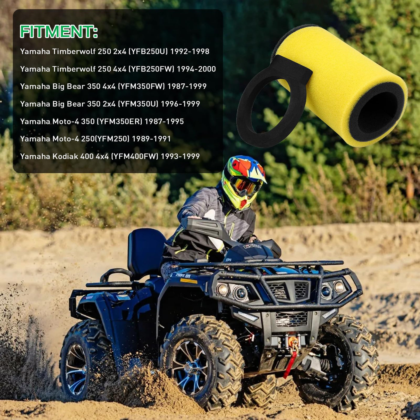 Q: What vehicles are compatible with the Yamaha air filter replacement?A: This air filter replacement is compatible with several Yamaha models, including the Timberwolf 250 (YFB250U and YFB250FW), Big Bear 350 (YFM350FW and YFM350U), Moto-4 250 and 350 (YFM250 and YFM350ER), and Kodiak 400 (YFM400FW) from various years.