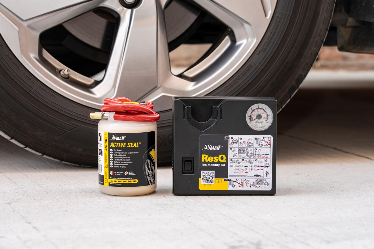 Q: What items are included in the AirMan ResQ Tire Repair Kit?A: The AirMan ResQ Tire Repair Kit includes a high-performance 12v compressor, a storage bag, a 450ml eco sealant, and various adapters to cater to different inflation needs.