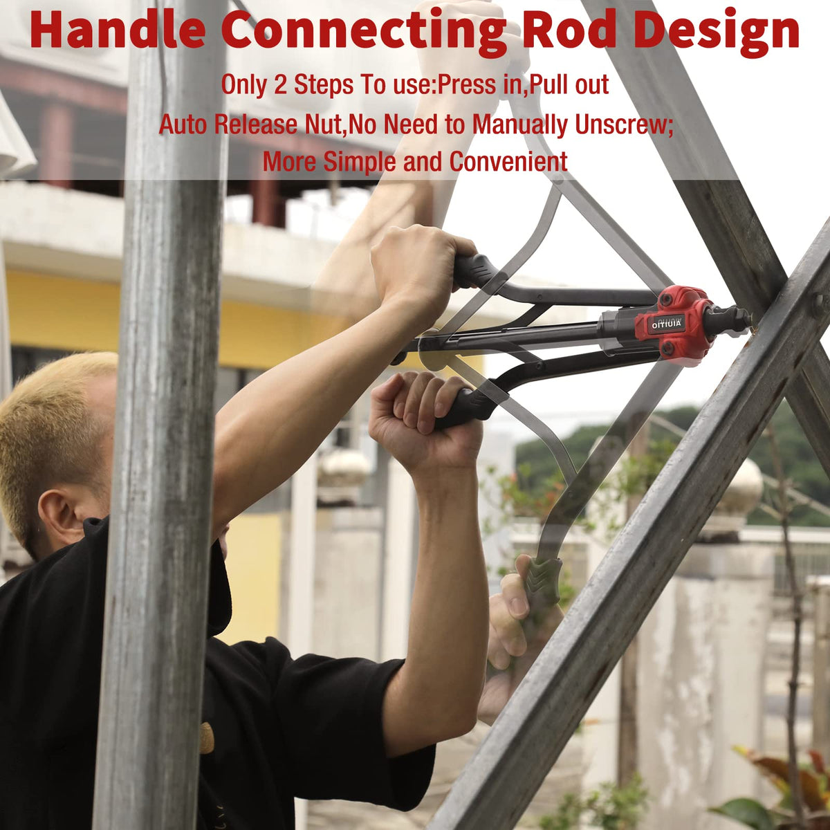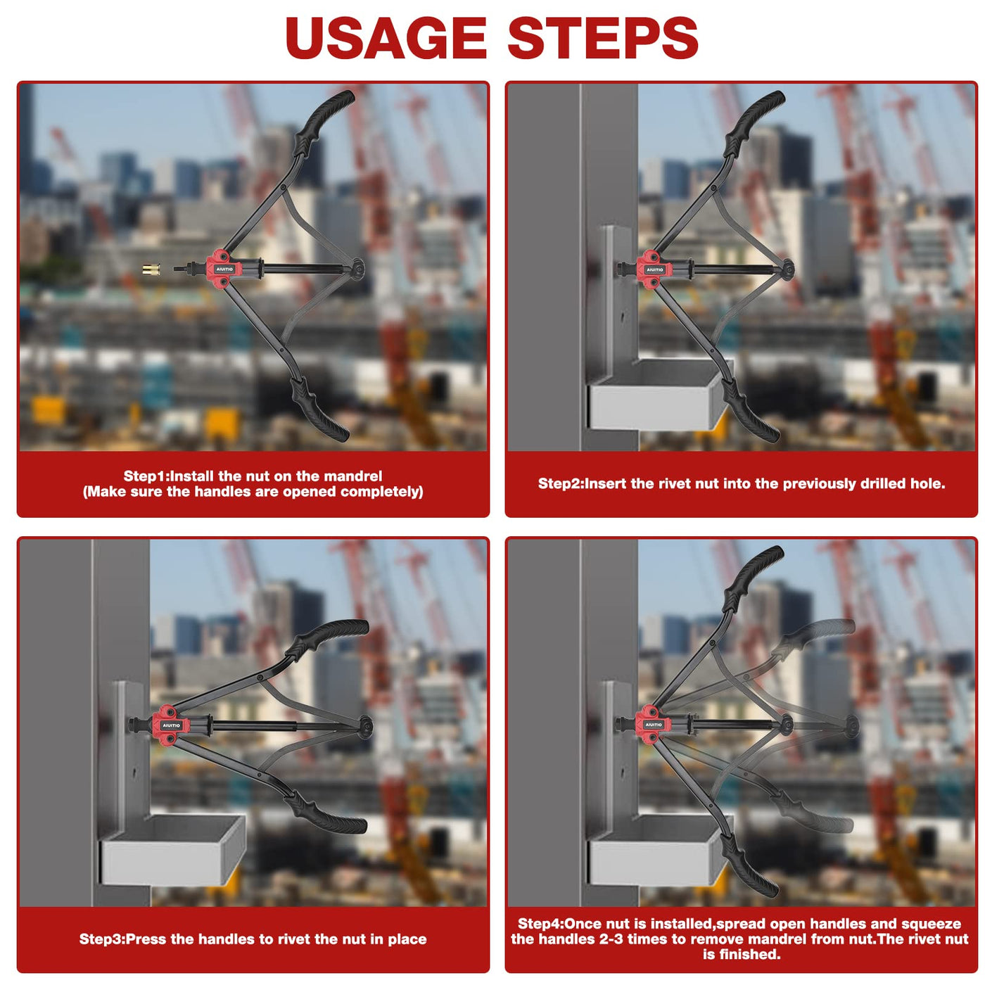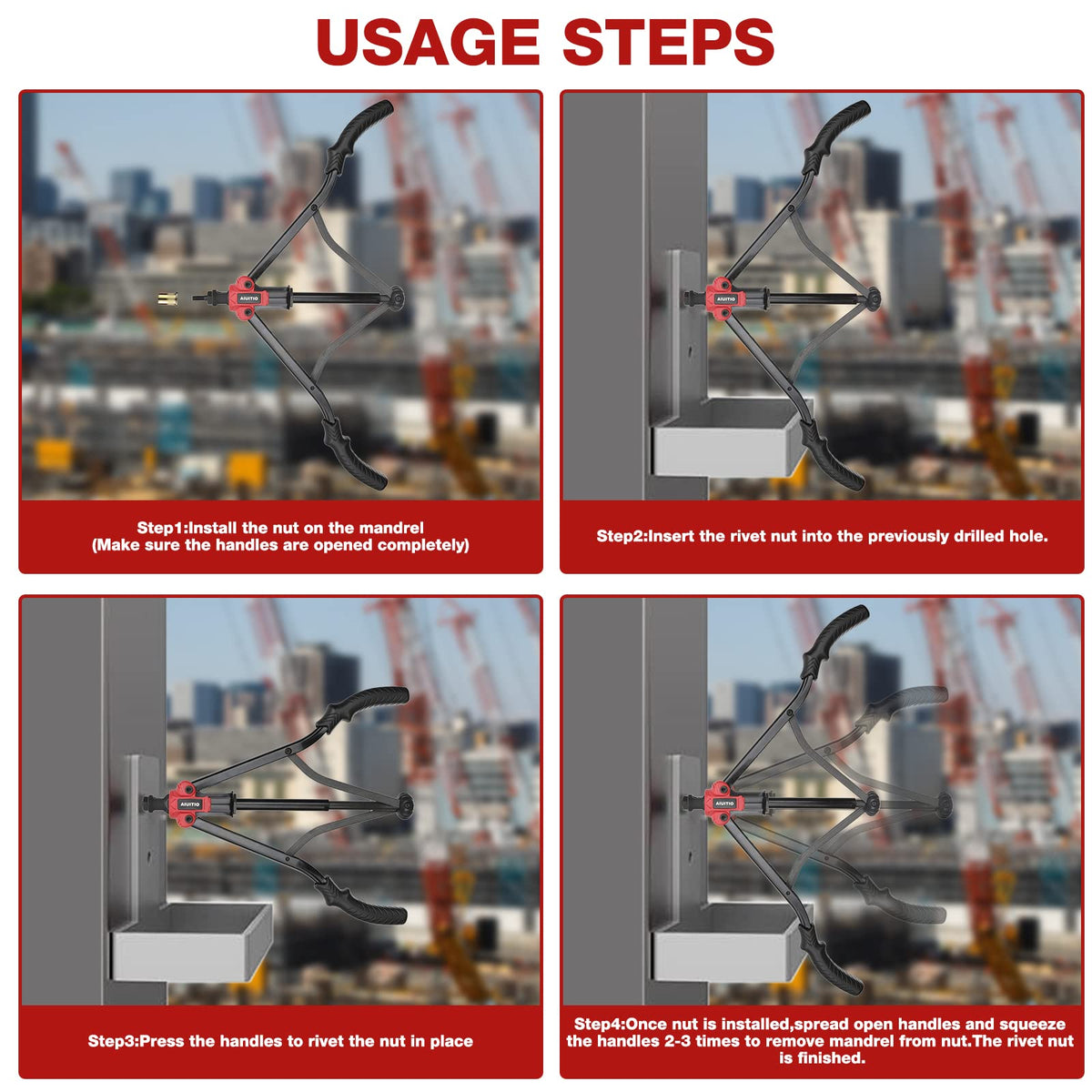 Only two steps to use: 1.Press in,Press the handles to rivet the nut in place; 2. Pull out,Once nut is installed, spread open handles and squeeze the handles 2-3 times, pull out.